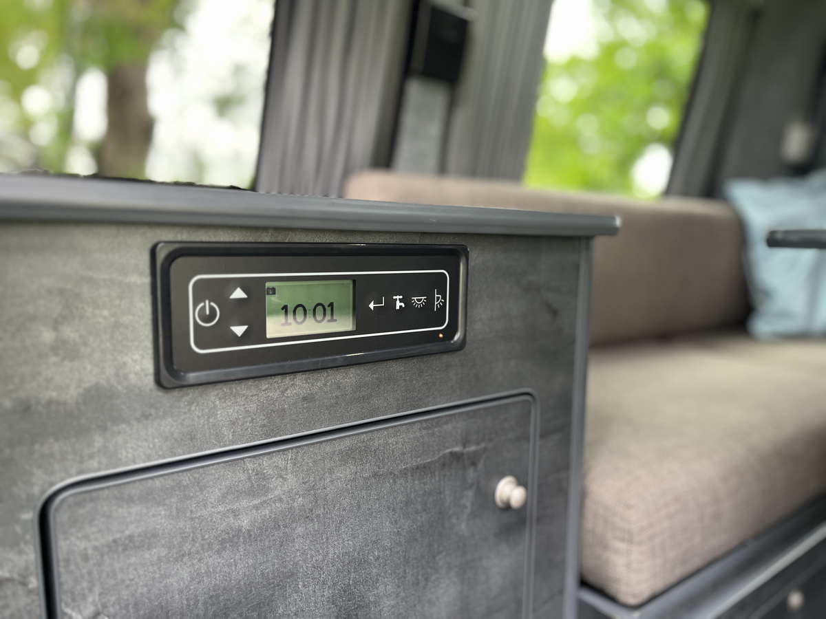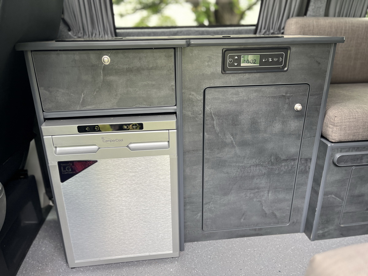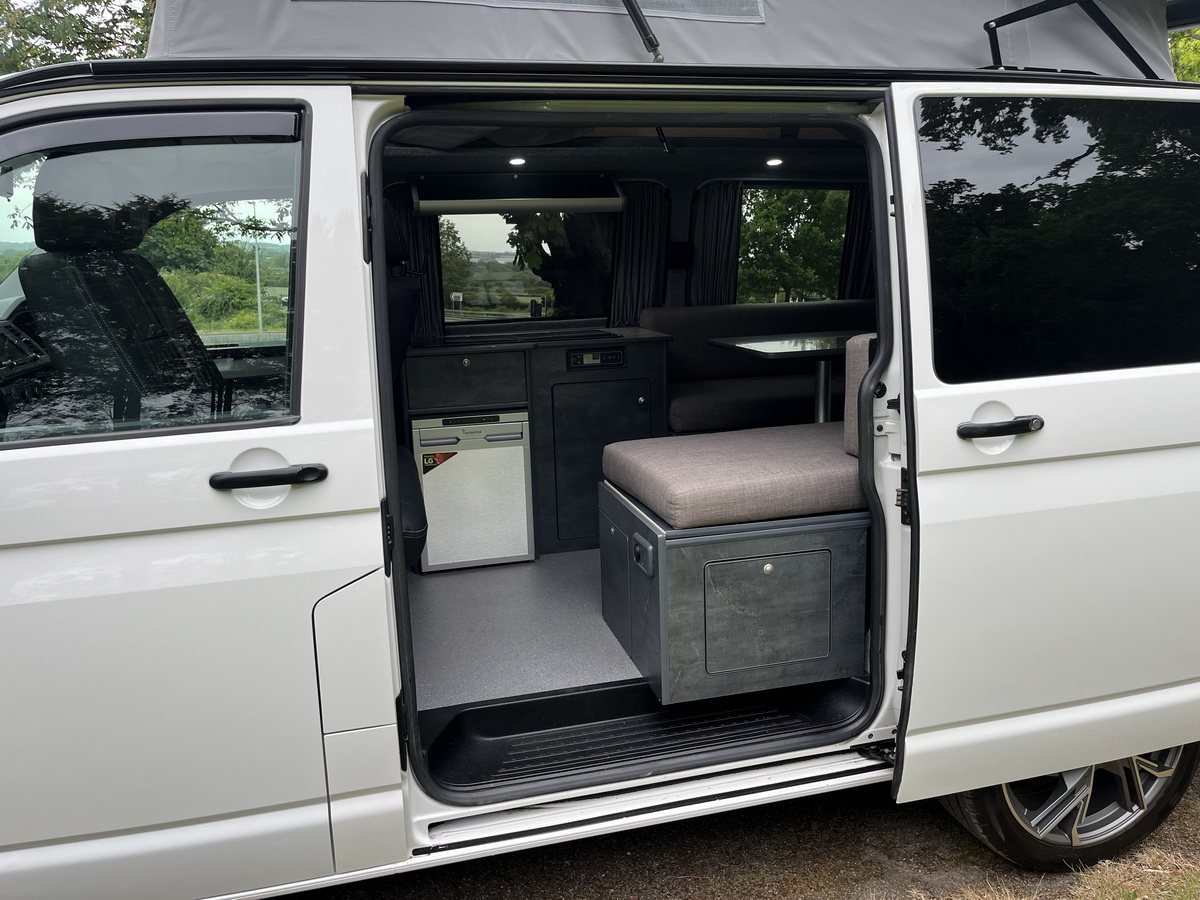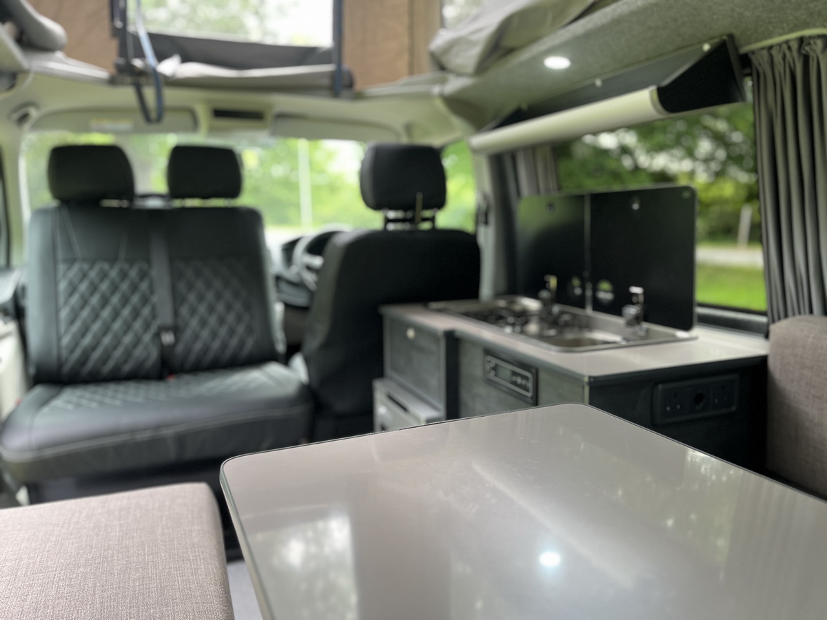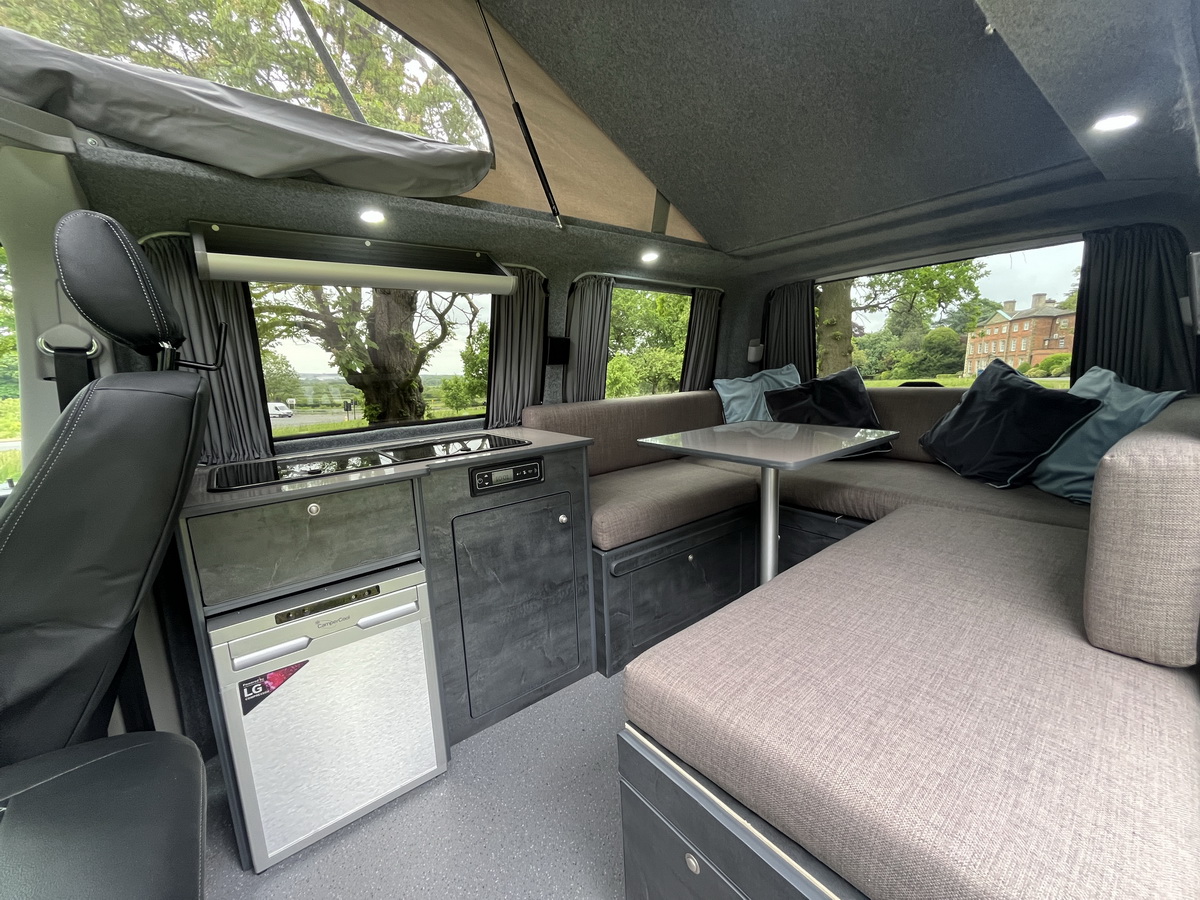 Built on the same high-quality foundation as our standard Iconic Conversion, this layout includes all the usual essentials — insulation, windows, electrics, upgraded flooring, lighting and the Austops elevating roof — but replaces the full-length furniture with a compact, space-efficient kitchen pod positioned neatly in the rear corner.