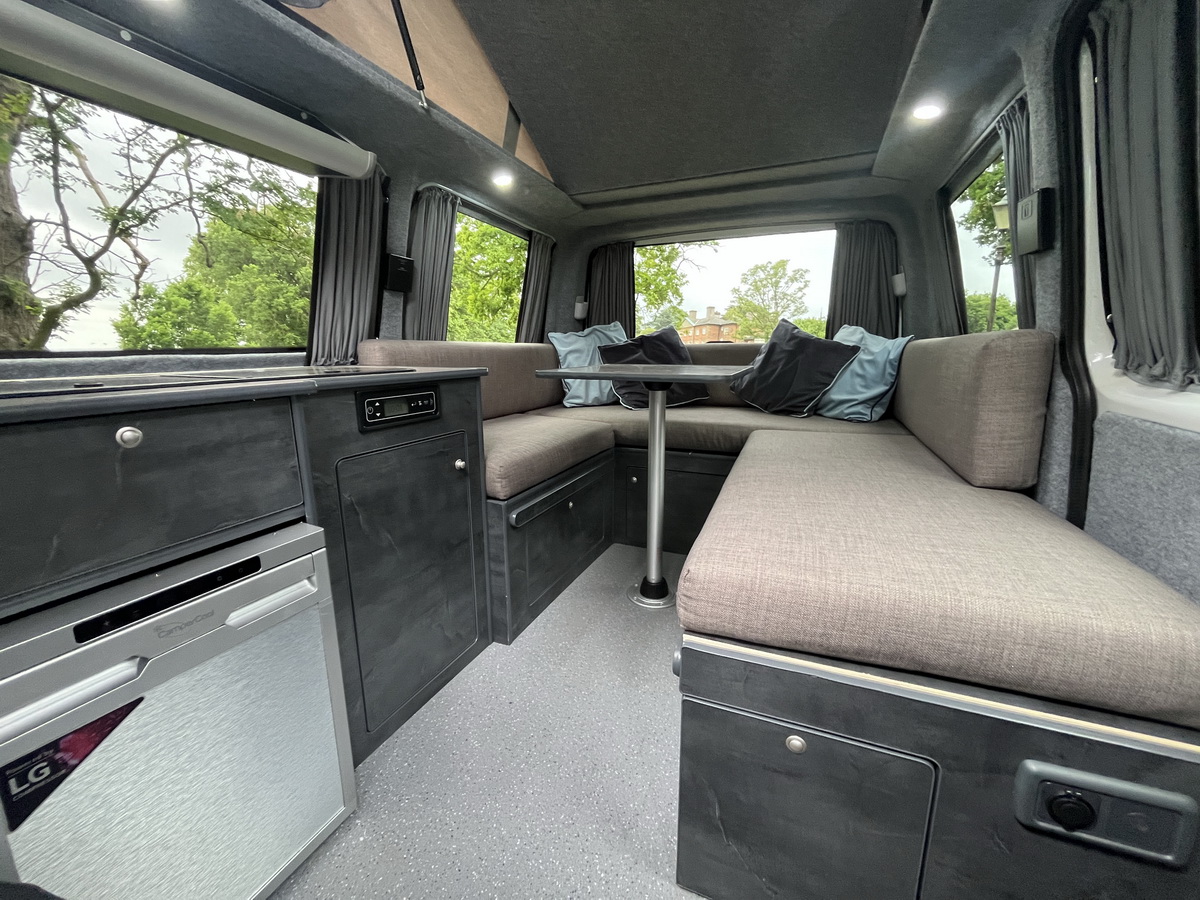 Our Iconic U-Shape Conversion is designed for customers who prefer a more open, social and flexible living space inside their camper. Rather than the traditional side-furniture layout and rock ’n’ roll bed system, this conversion features a spacious U-shaped seating area, creating a relaxed lounge environment perfect for dining, socialising, or unwinding after a long day.