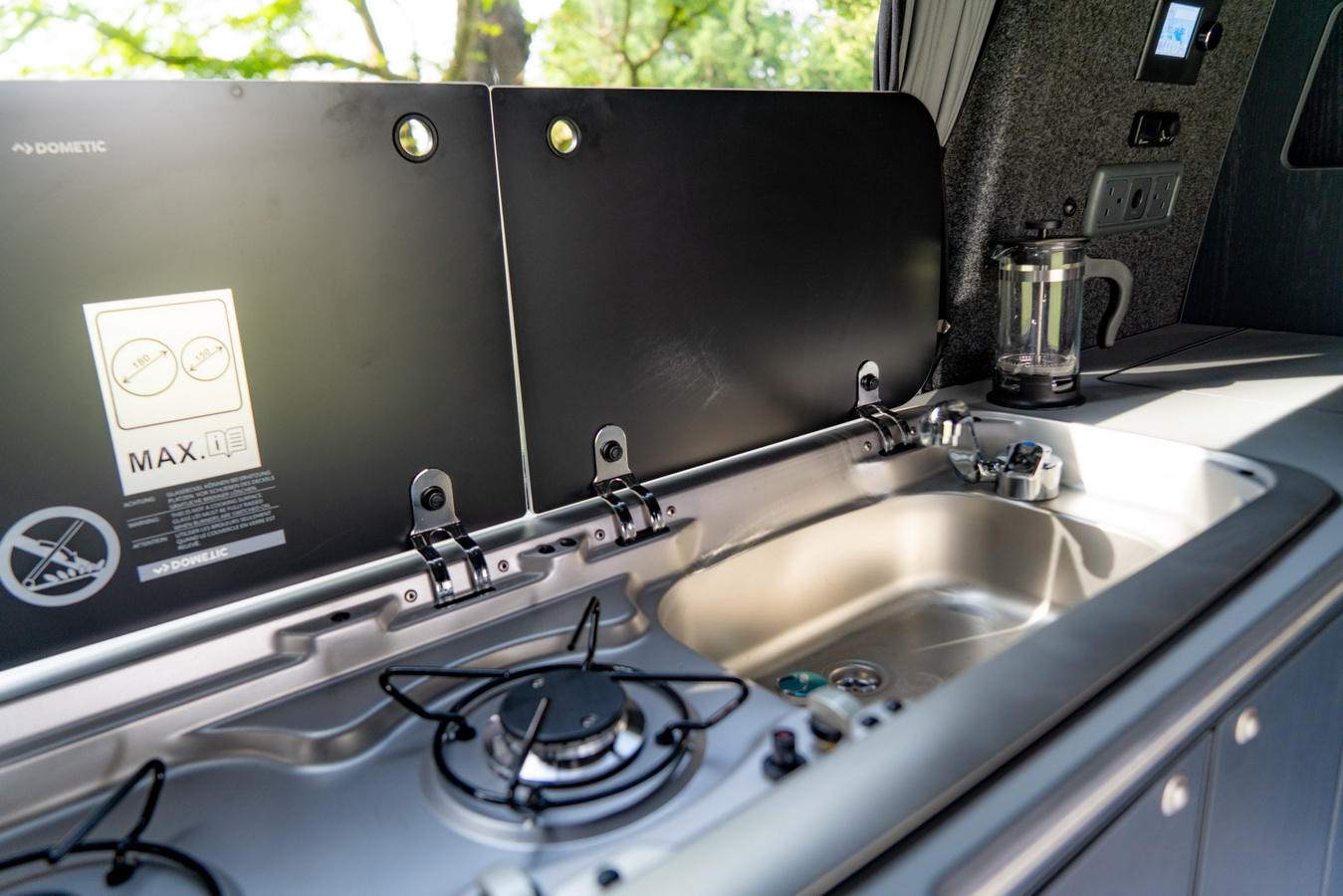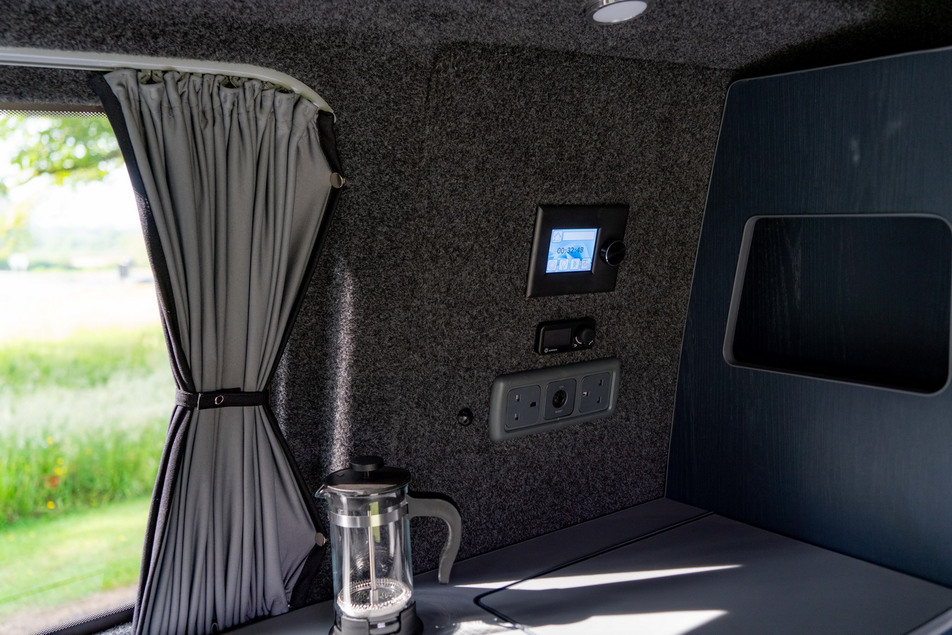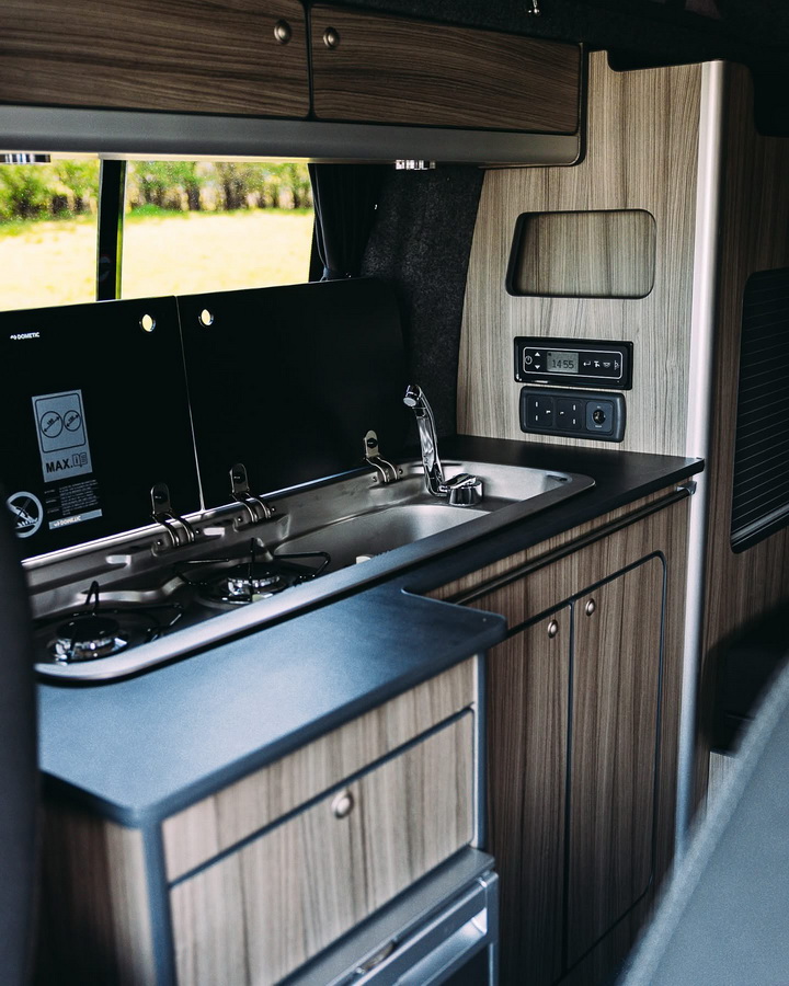 Lighting is provided by bright standard LED spotlights, and all onboard systems are controlled via the 5″ Savvy Van control screen. Power is delivered by the Victron B2B charger with a 110Ah leisure battery, ensuring reliable charging whether you’re driving or plugged in at a campsite.