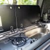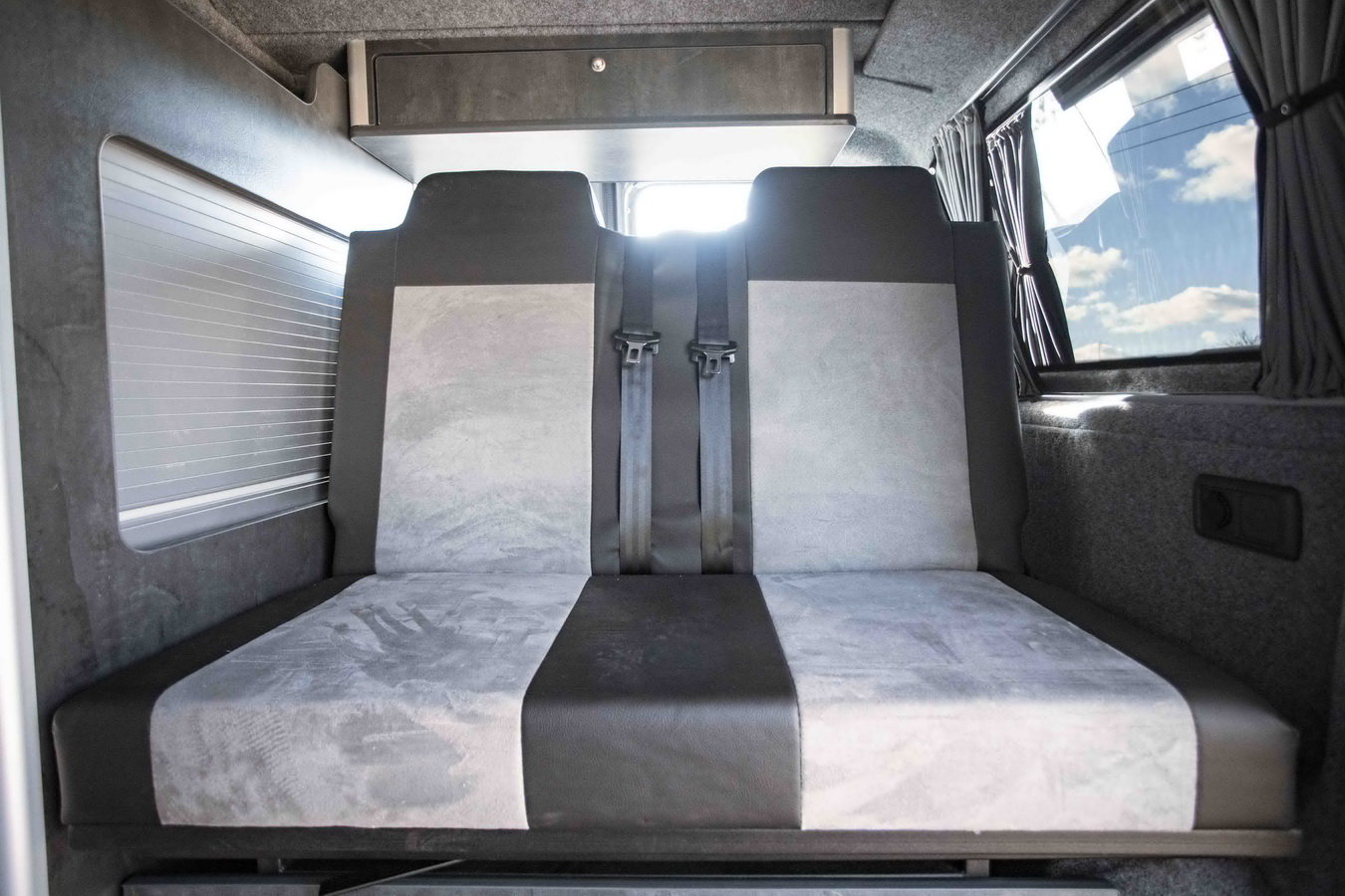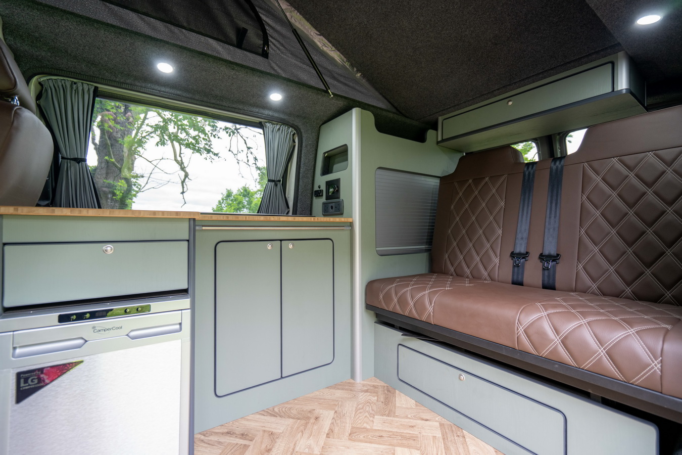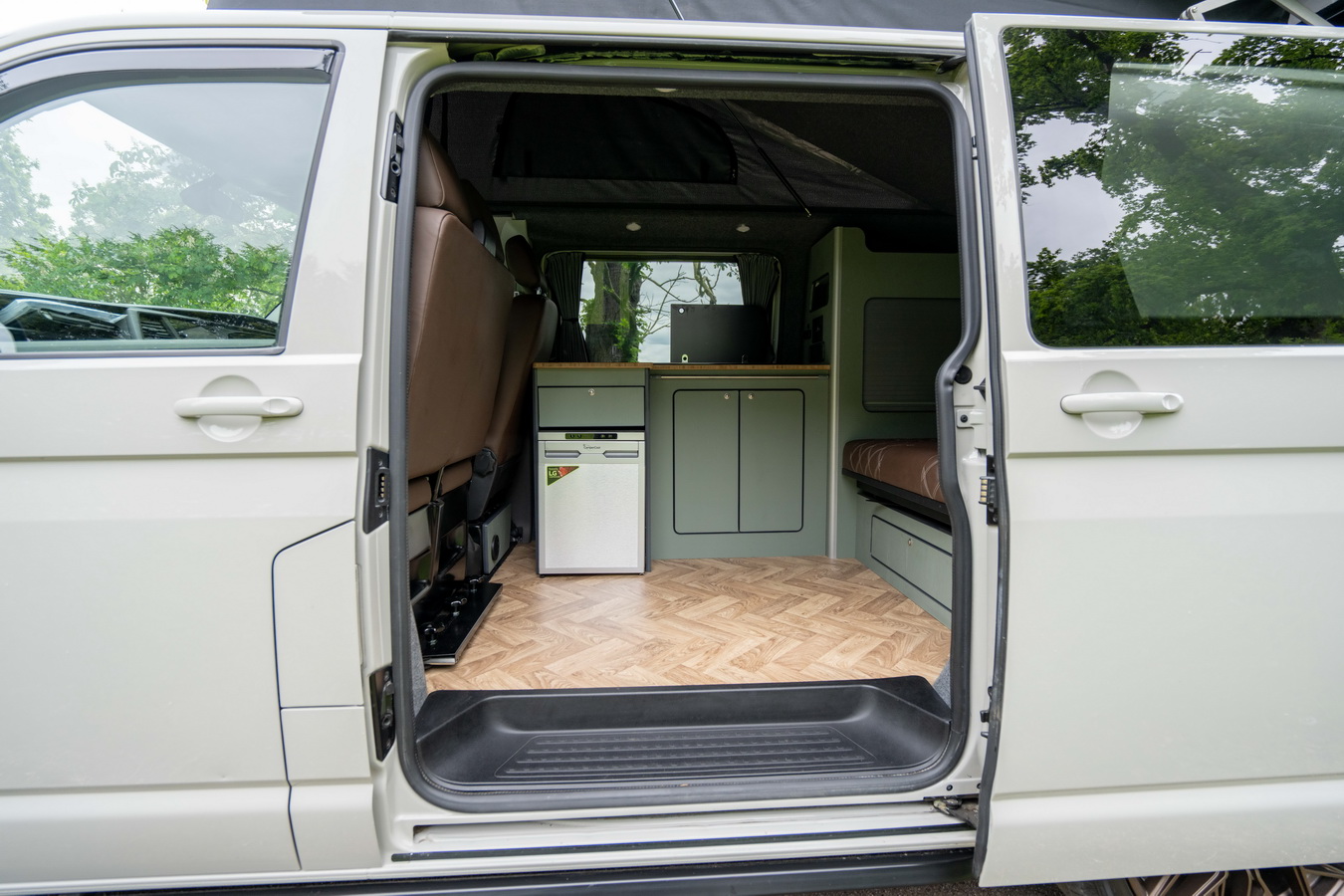 This conversion comfortably seats 4–5 (depending on cab configuration) and sleeps 4, thanks to the combination of a 3/4 width crash-tested rock and roll bed and the Austops elevating roof with 2-berth roof bed. The interior layout features our in-house lightweight furniture system with generous storage, available in a wide range of colour finishes.