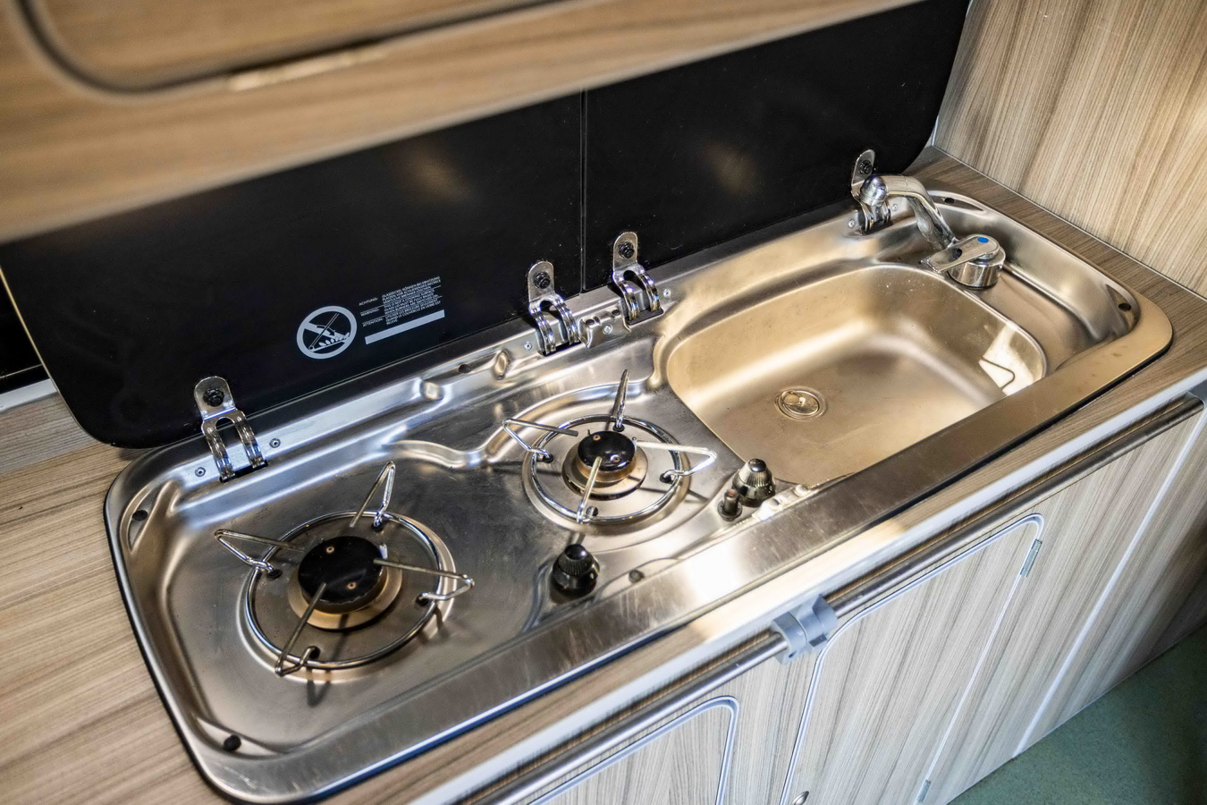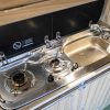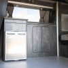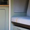 The kitchen area includes the Smev 9222s hob and sink combination, a removable water tank for easy filling, and a 50-litre fridge – ideal for weekend breaks or longer trips. Tambour door storage, matching table and rail, and an over-bed locker all contribute to a practical, well-organised interior.
