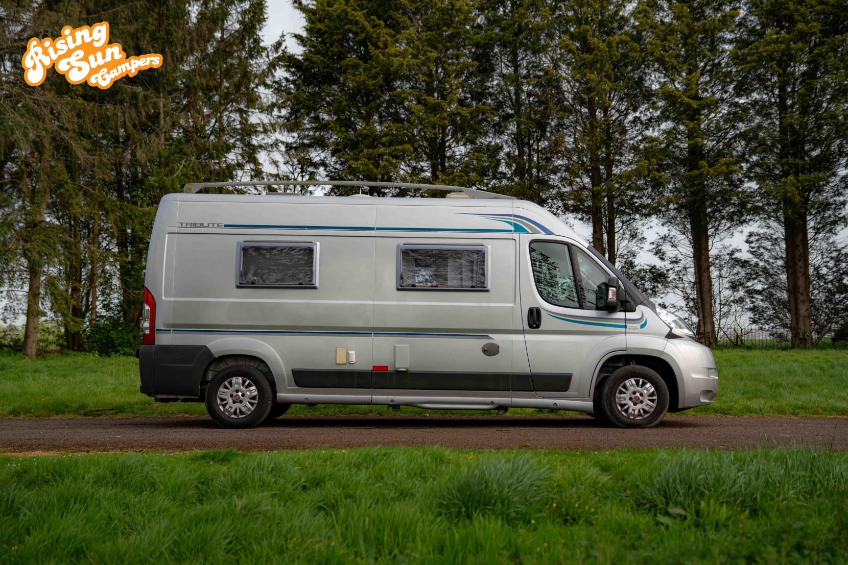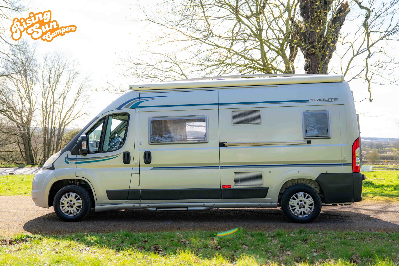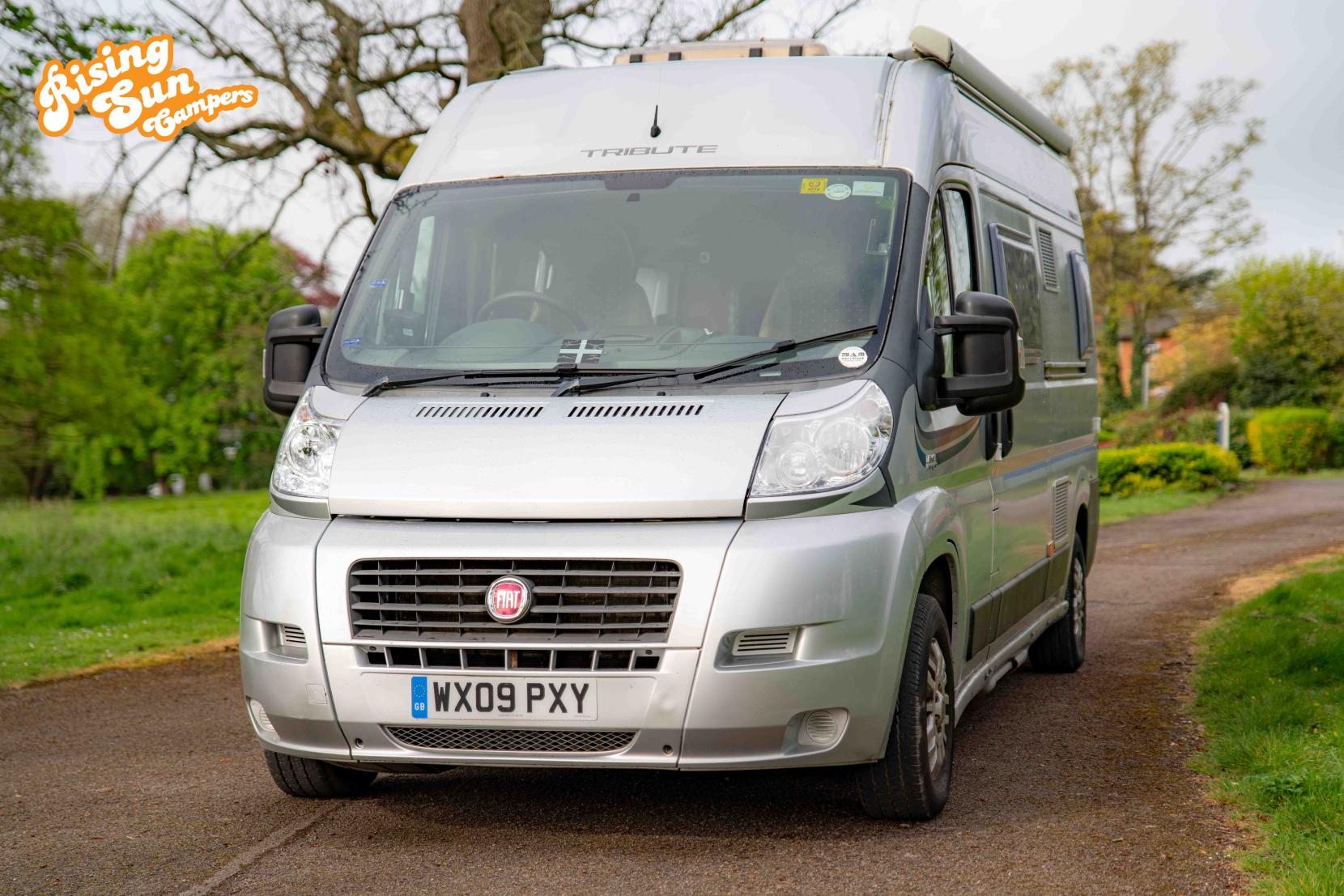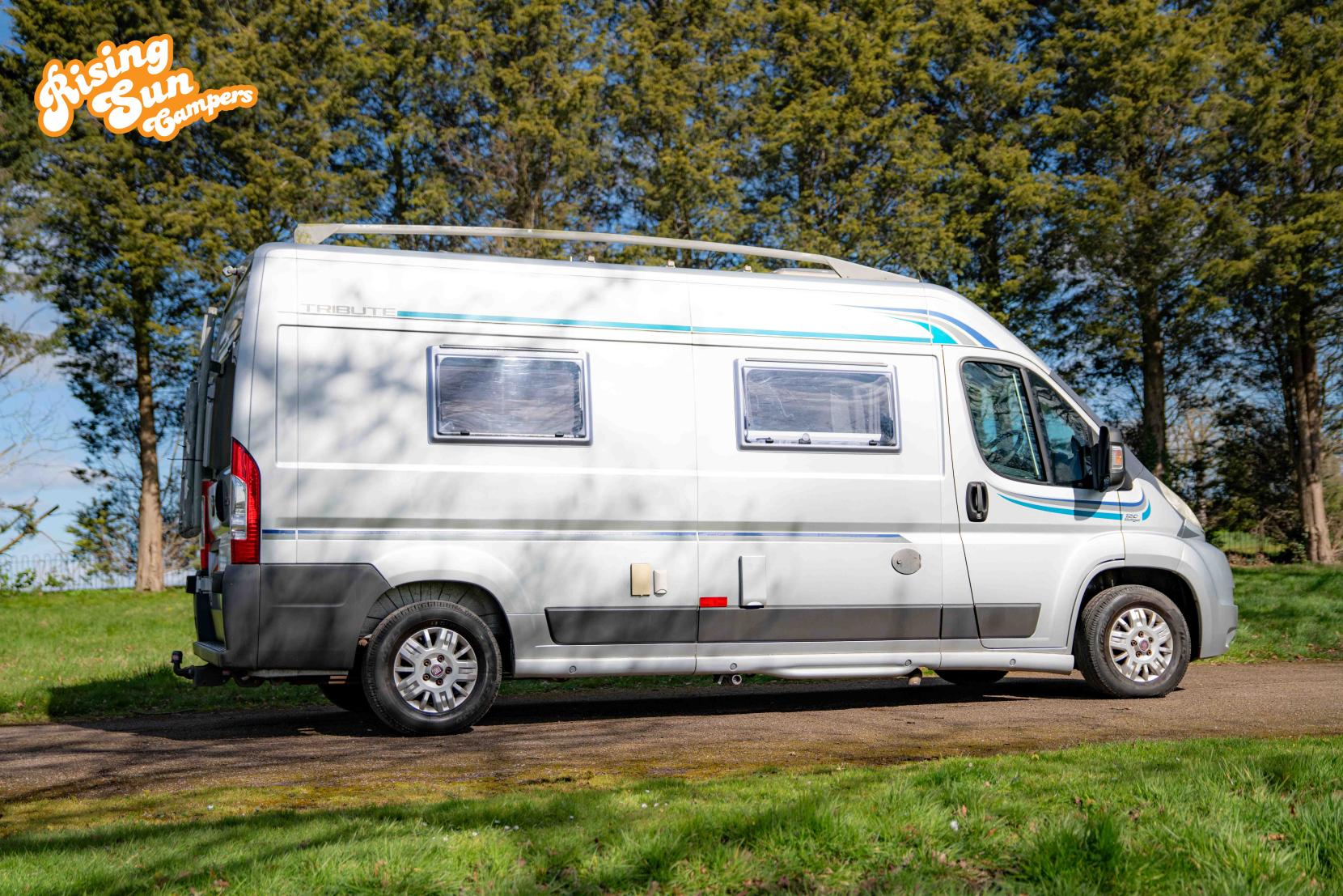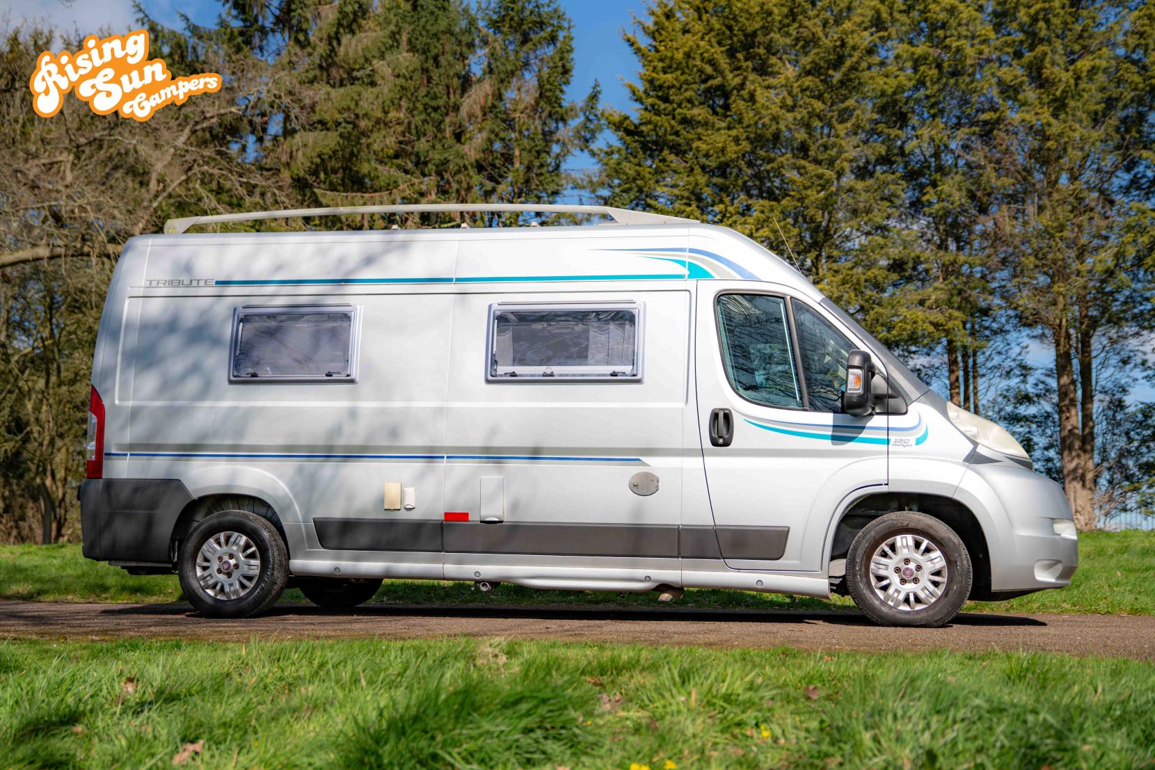 This Trigano Tribute sleeps two, has three seatbelts, is 6m long and has a gross weight of 3300kg. It is a High Top Van Conversion based on a 2.3 litre diesel engined Fiat Ducato with a manual gearbox and is Right Hand Drive.