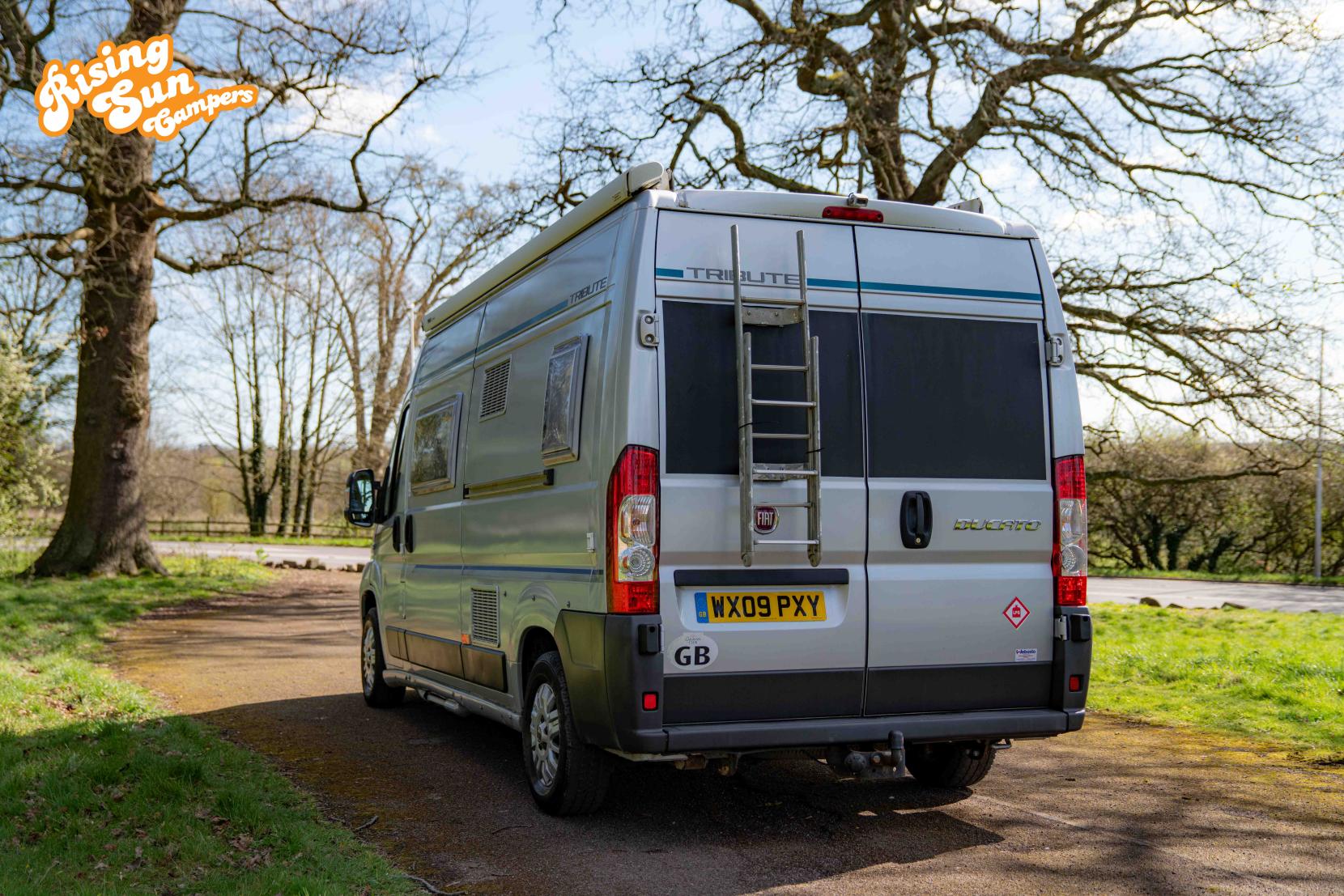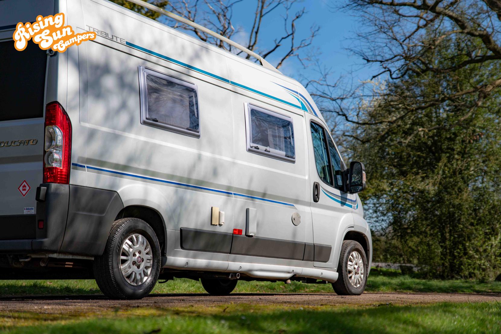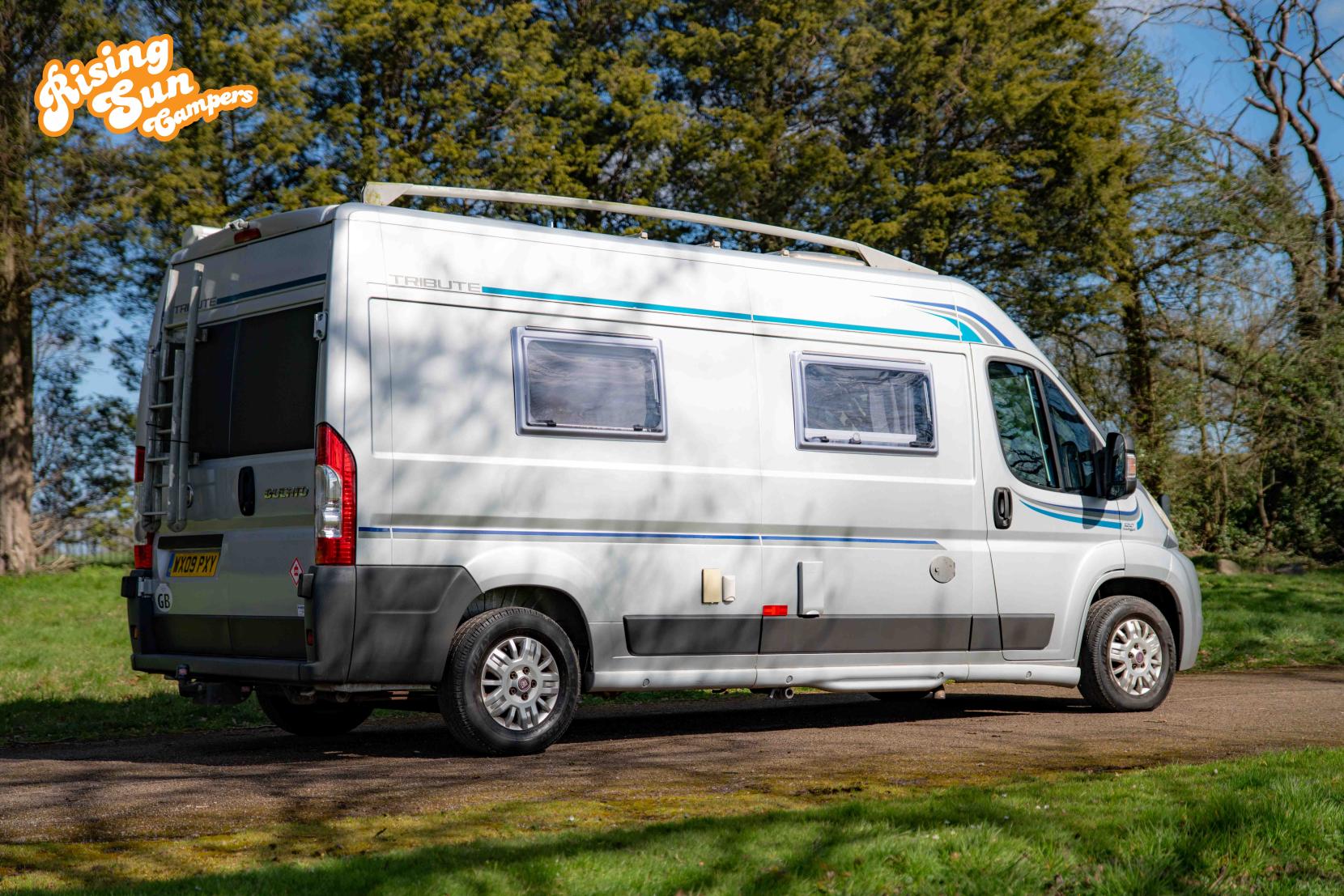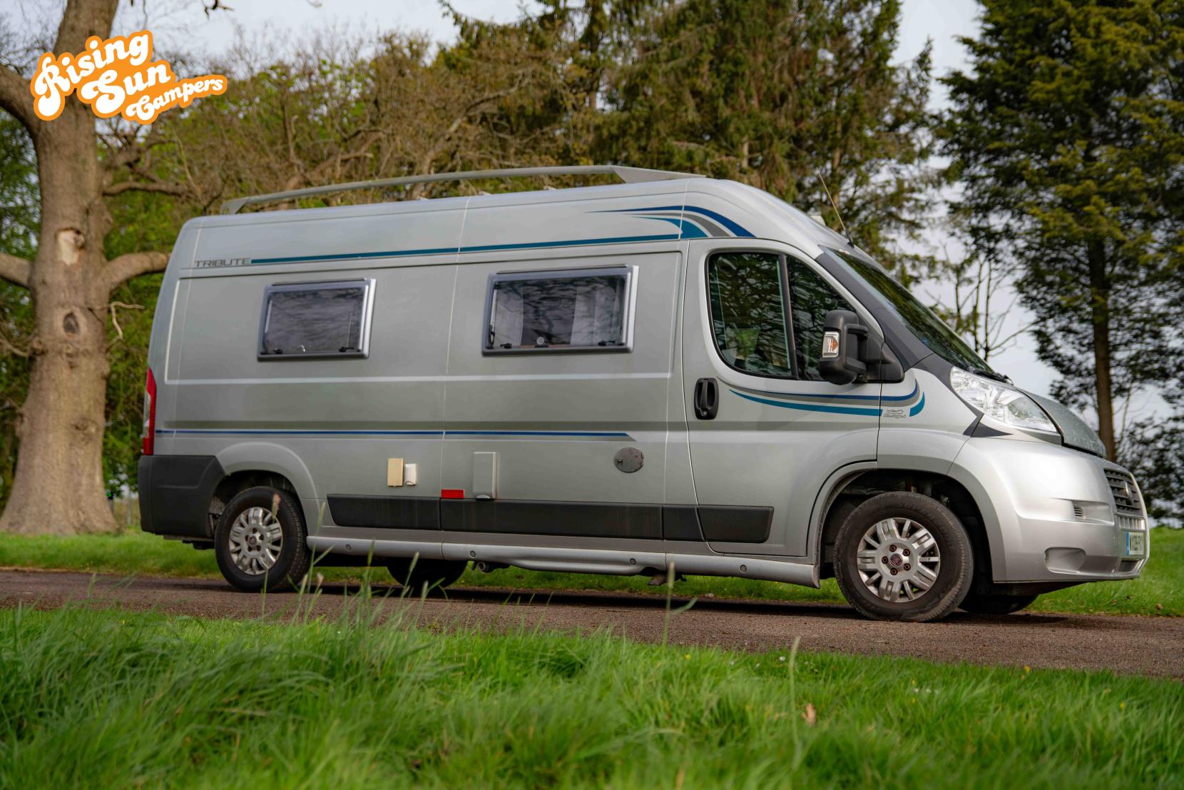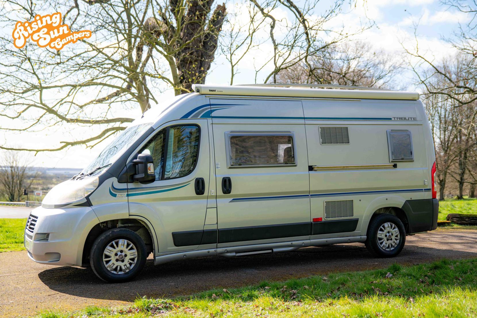 This Trigano Tribute sleeps two, has three seatbelts, is 6m long and has a gross weight of 3300kg. It is a High Top Van Conversion based on a 2.3 litre diesel engined Fiat Ducato with a manual gearbox and is Right Hand Drive.