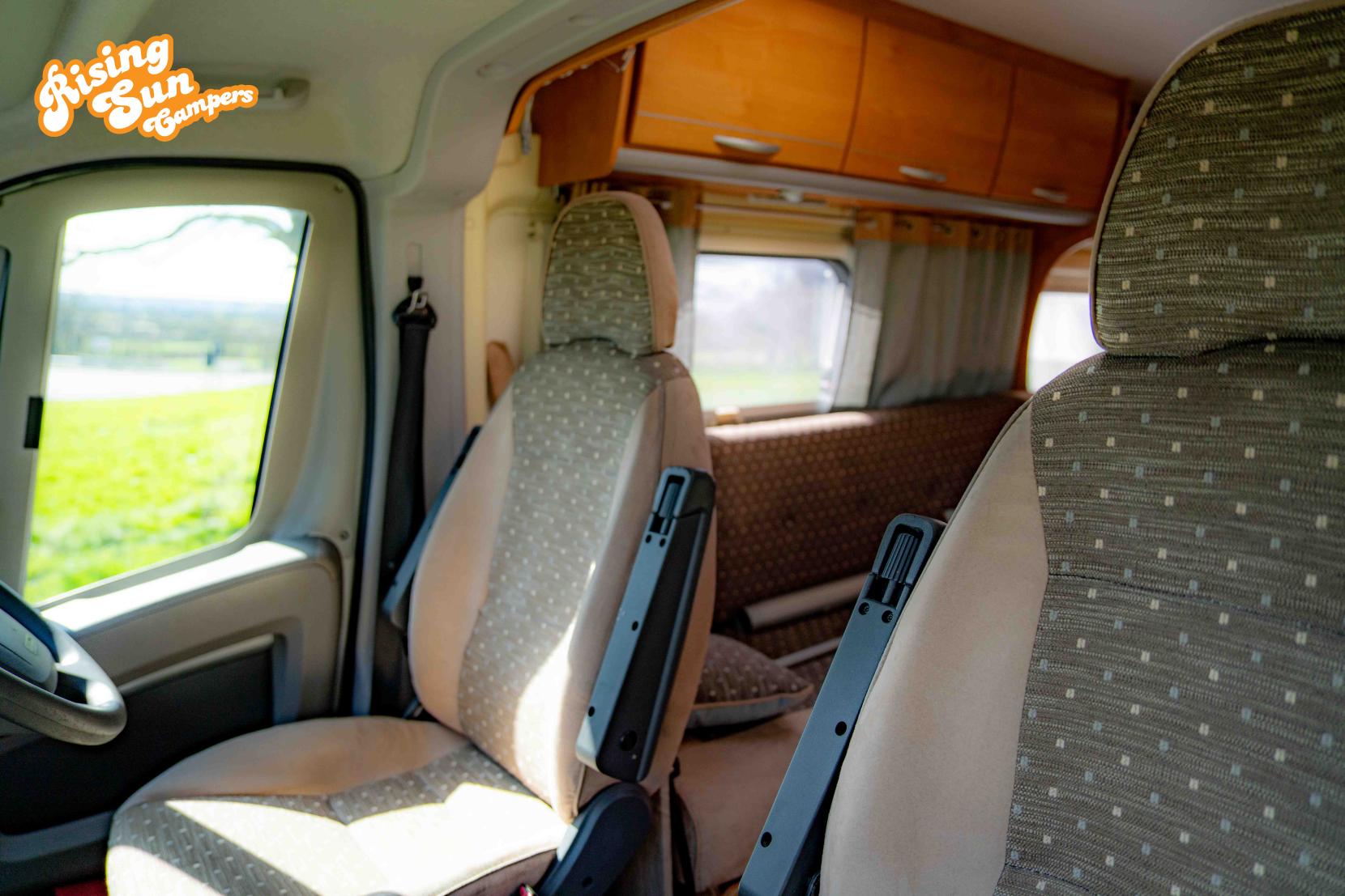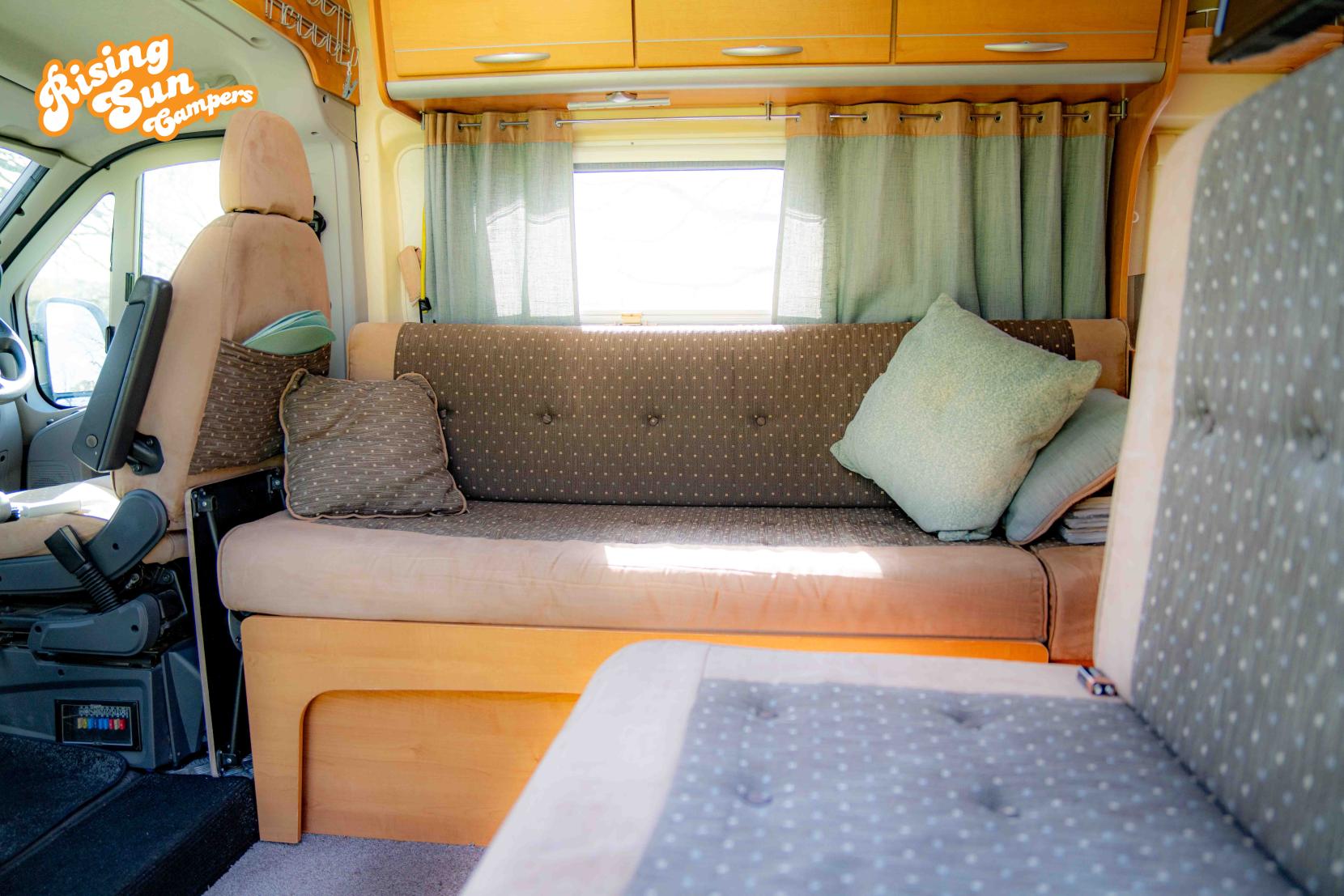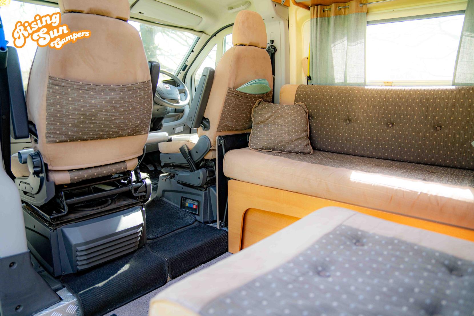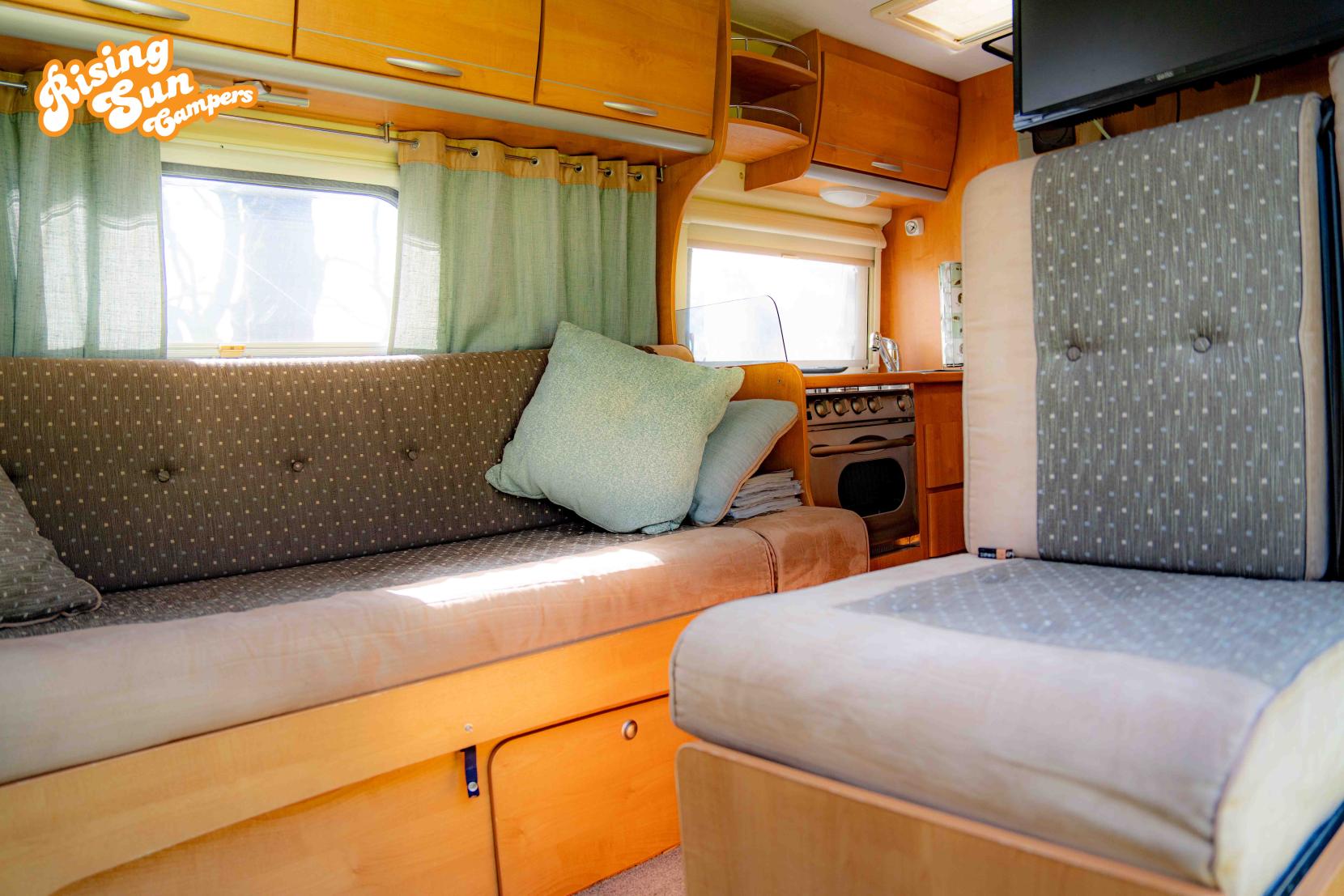 On entering via the side sliding door to you right is a single belted seat, a long settee on the opposite side with two swivelling cab seats making up this lounge area.