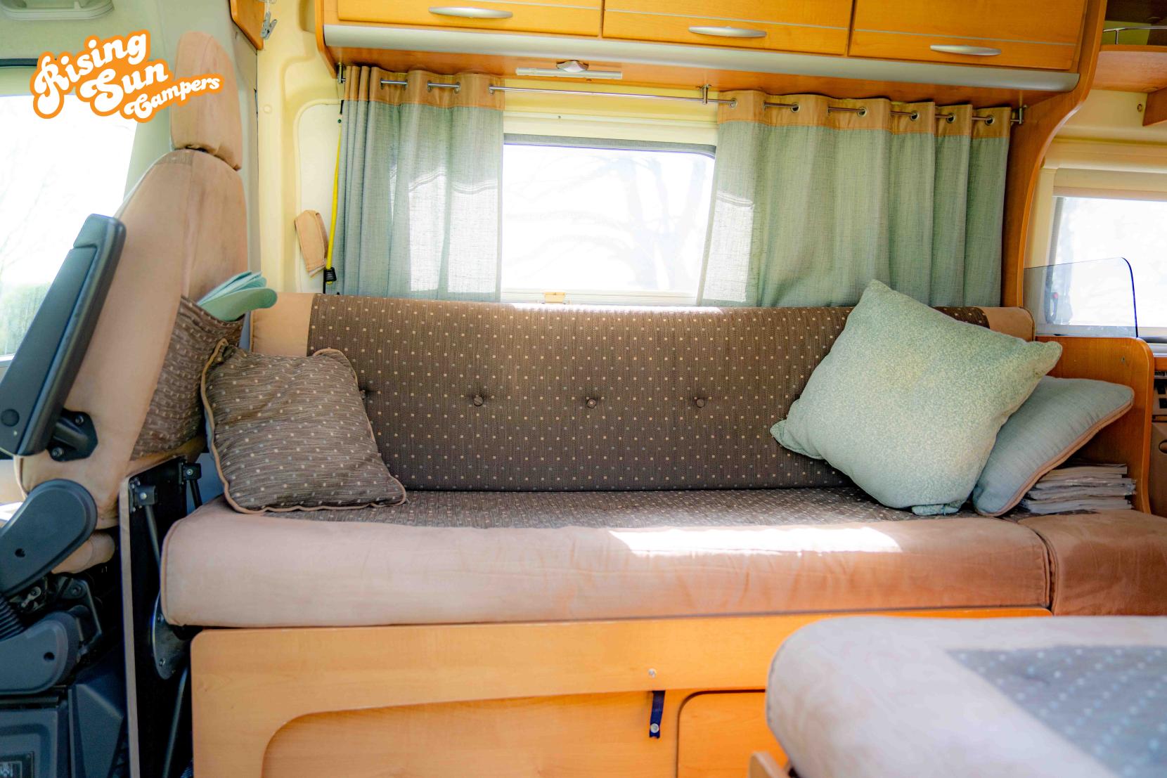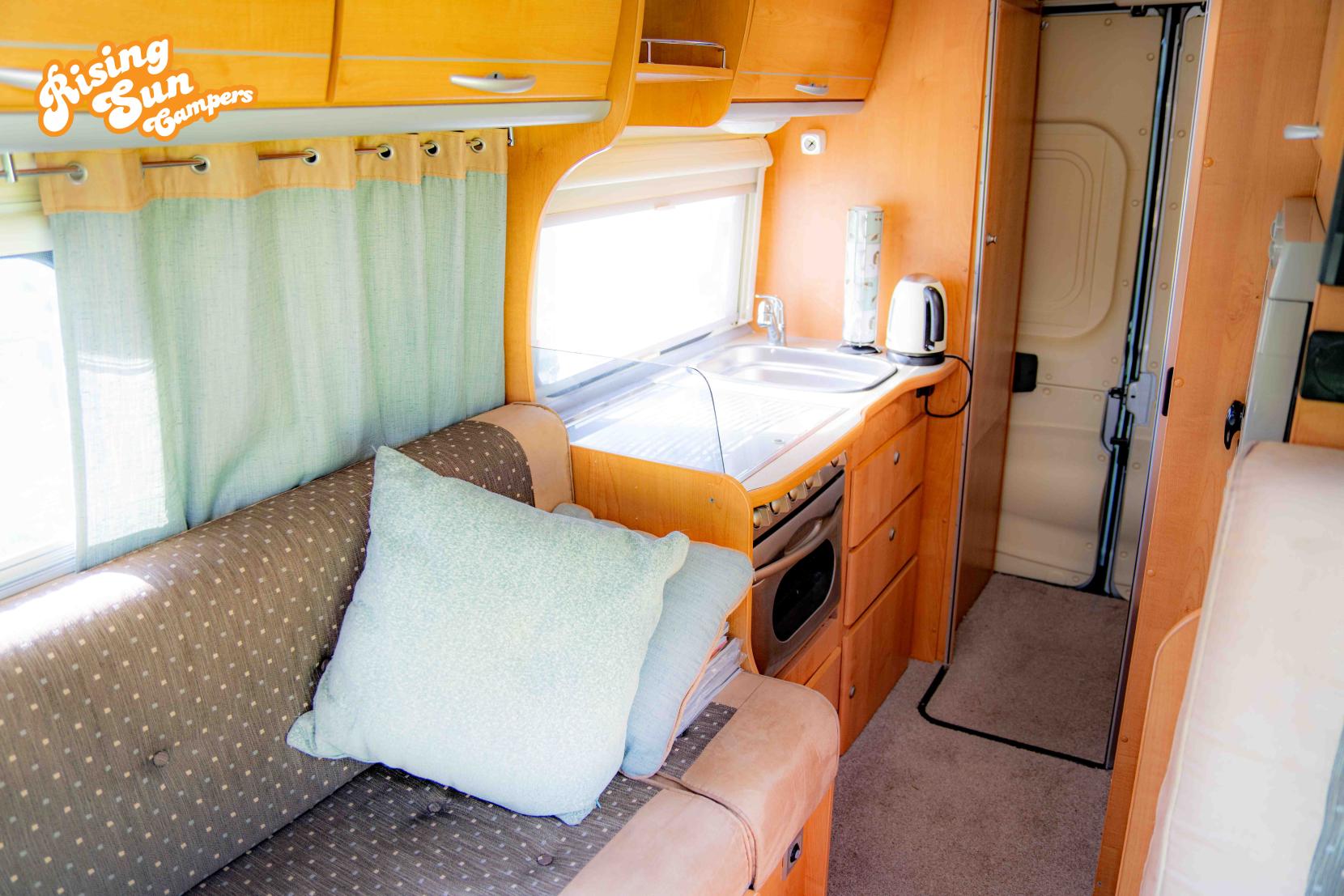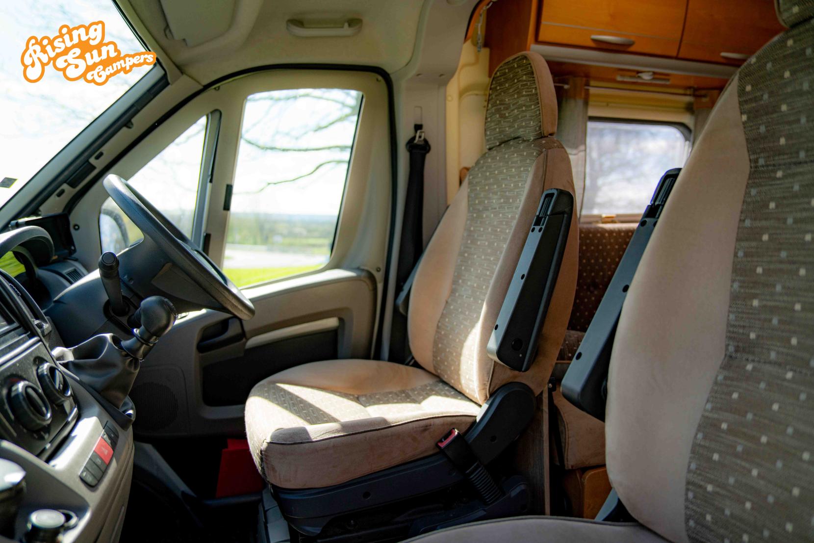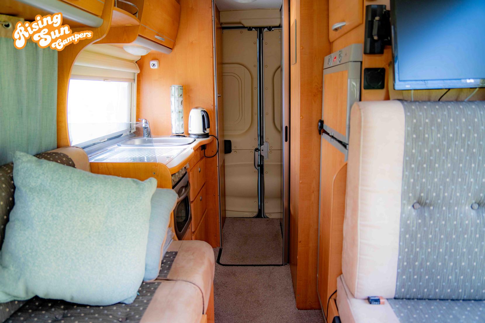 On entering via the side sliding door to you right is a single belted seat, a long settee on the opposite side with two swivelling cab seats making up this lounge area.