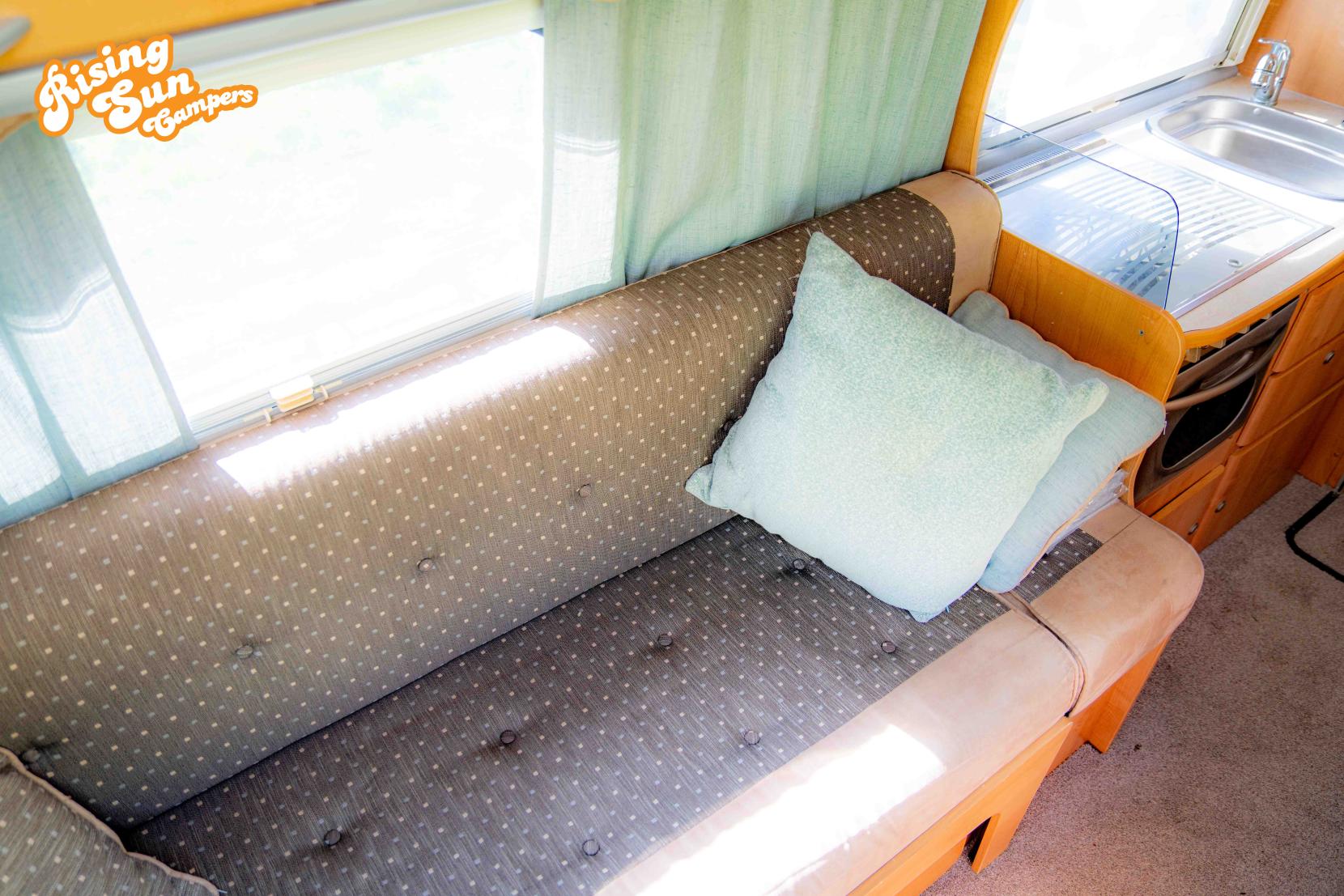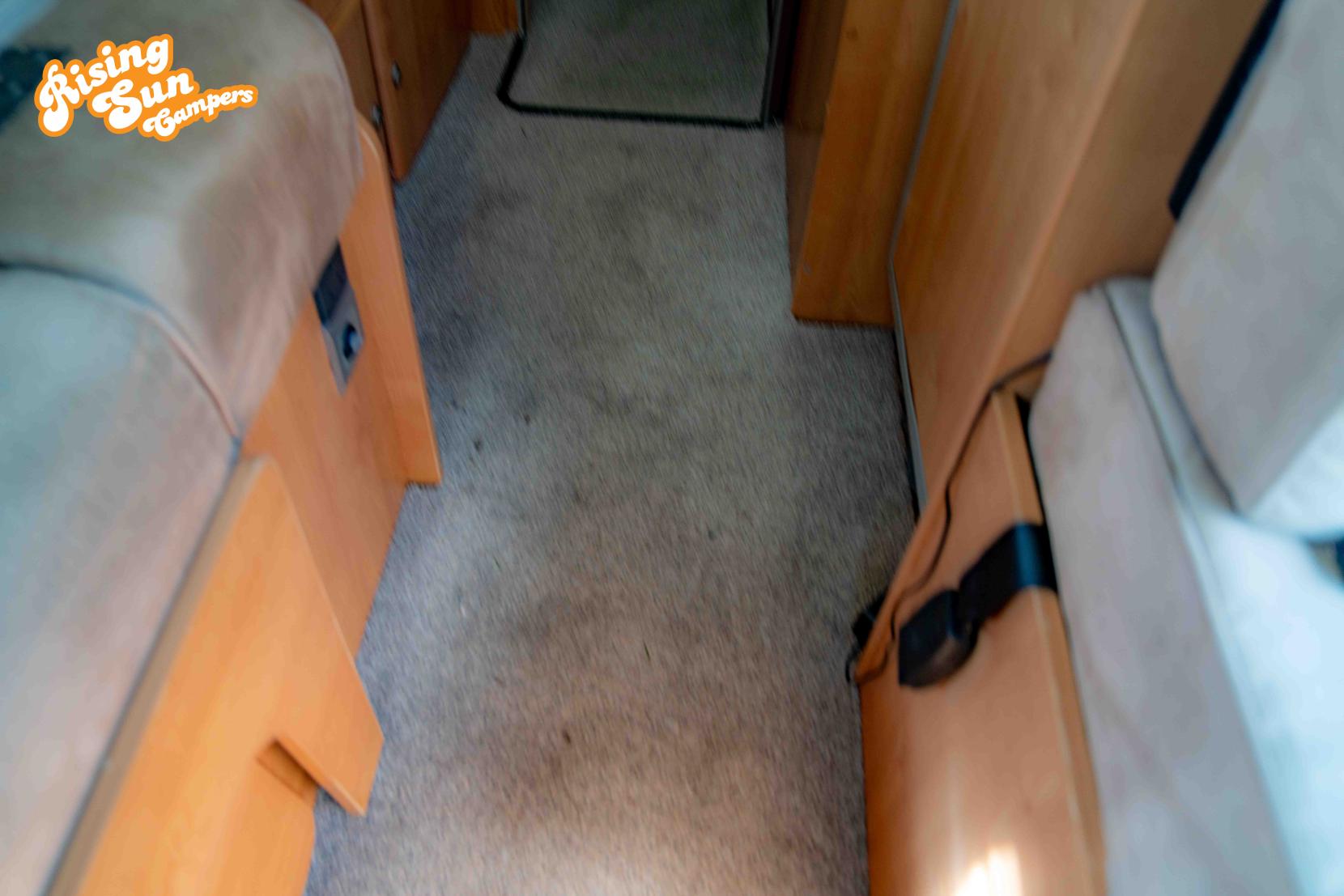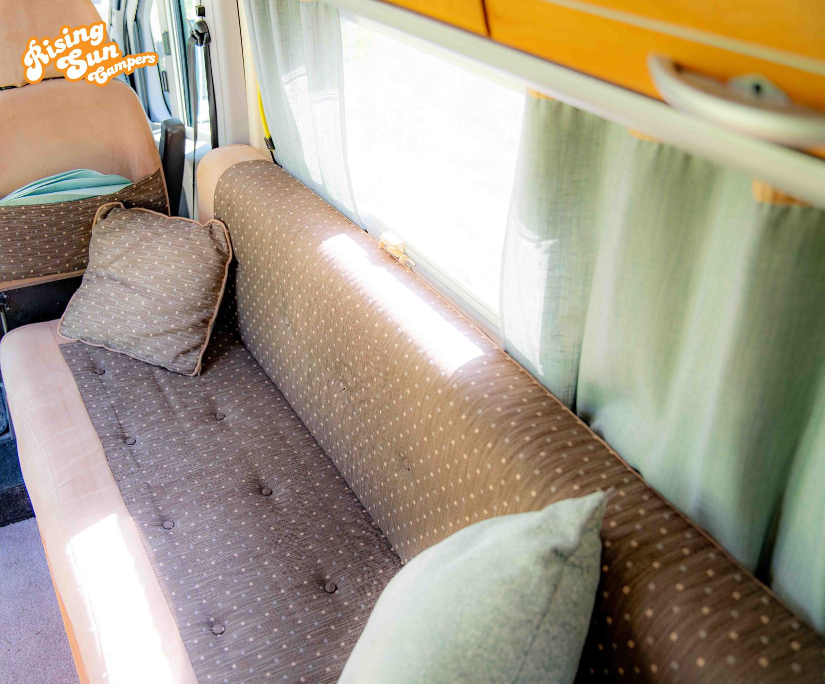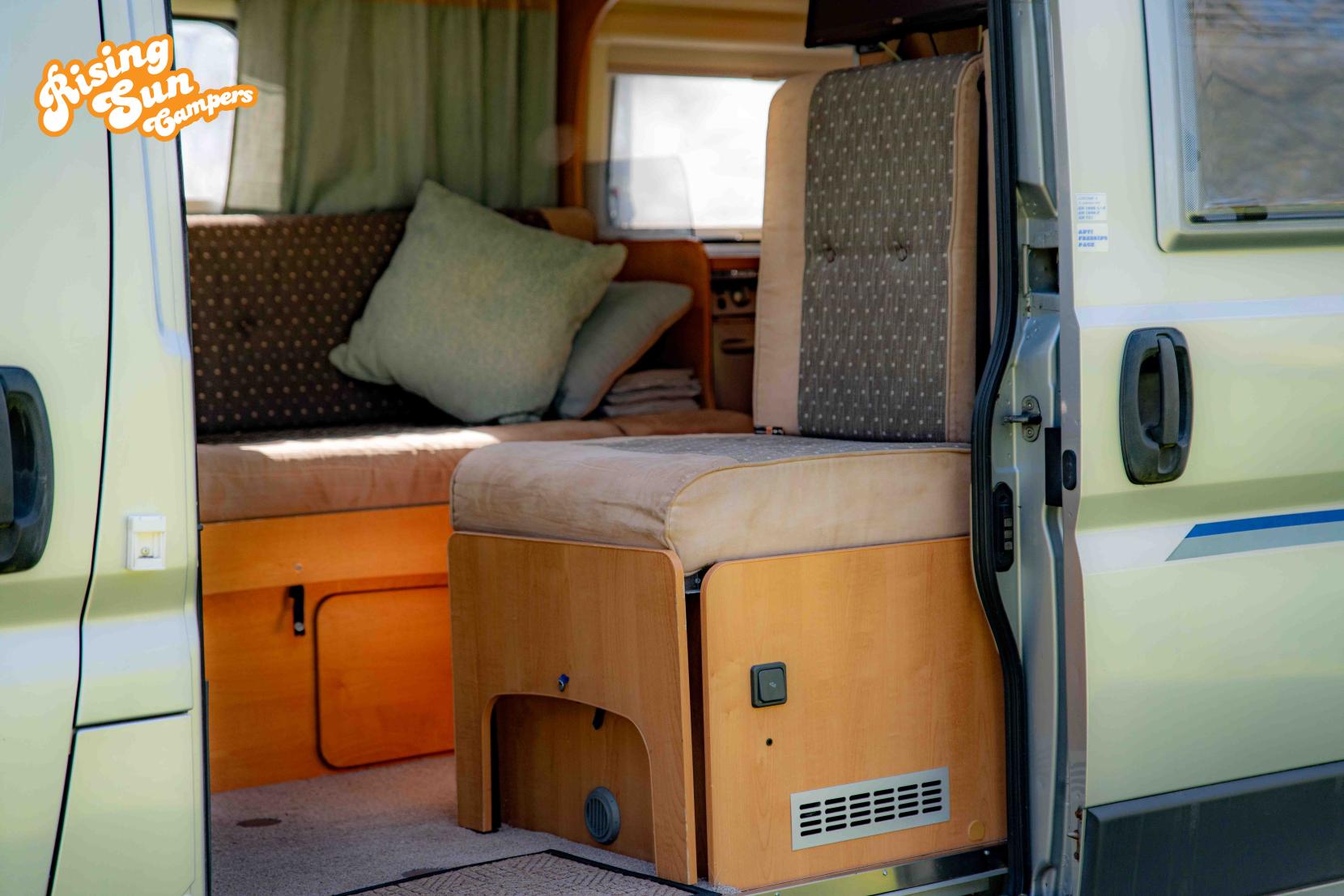 On entering via the side sliding door to you right is a single belted seat, a long settee on the opposite side with two swivelling cab seats making up this lounge area.
