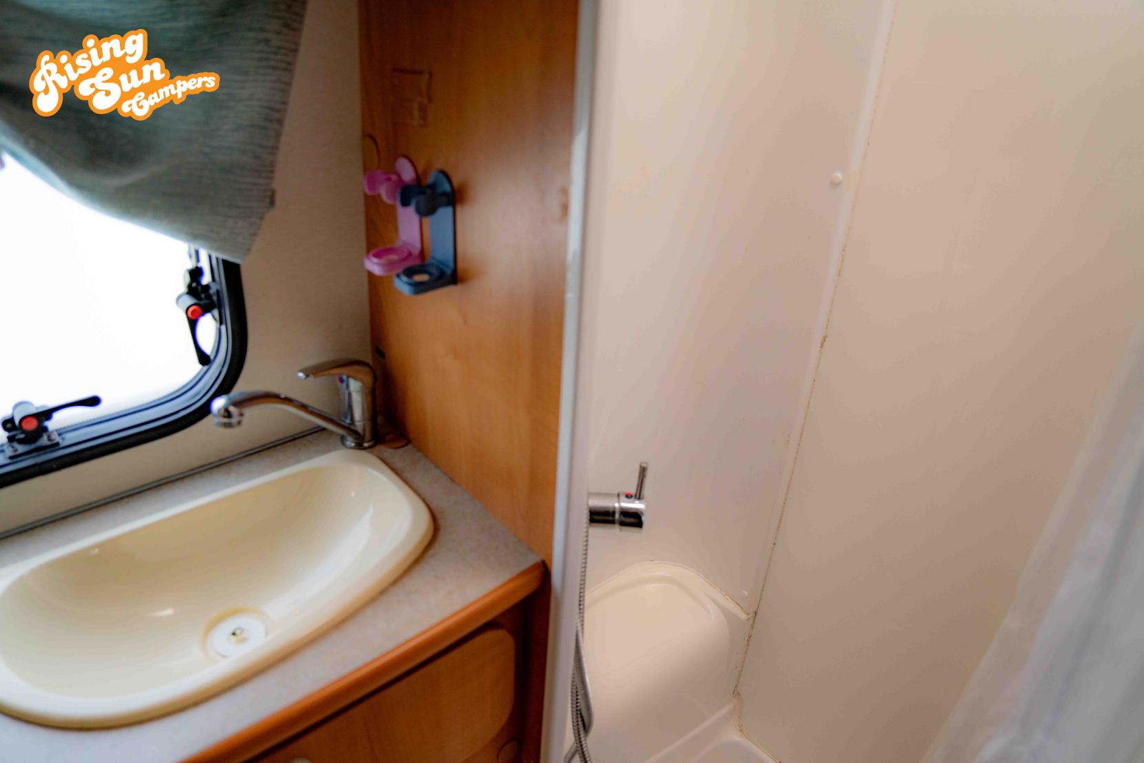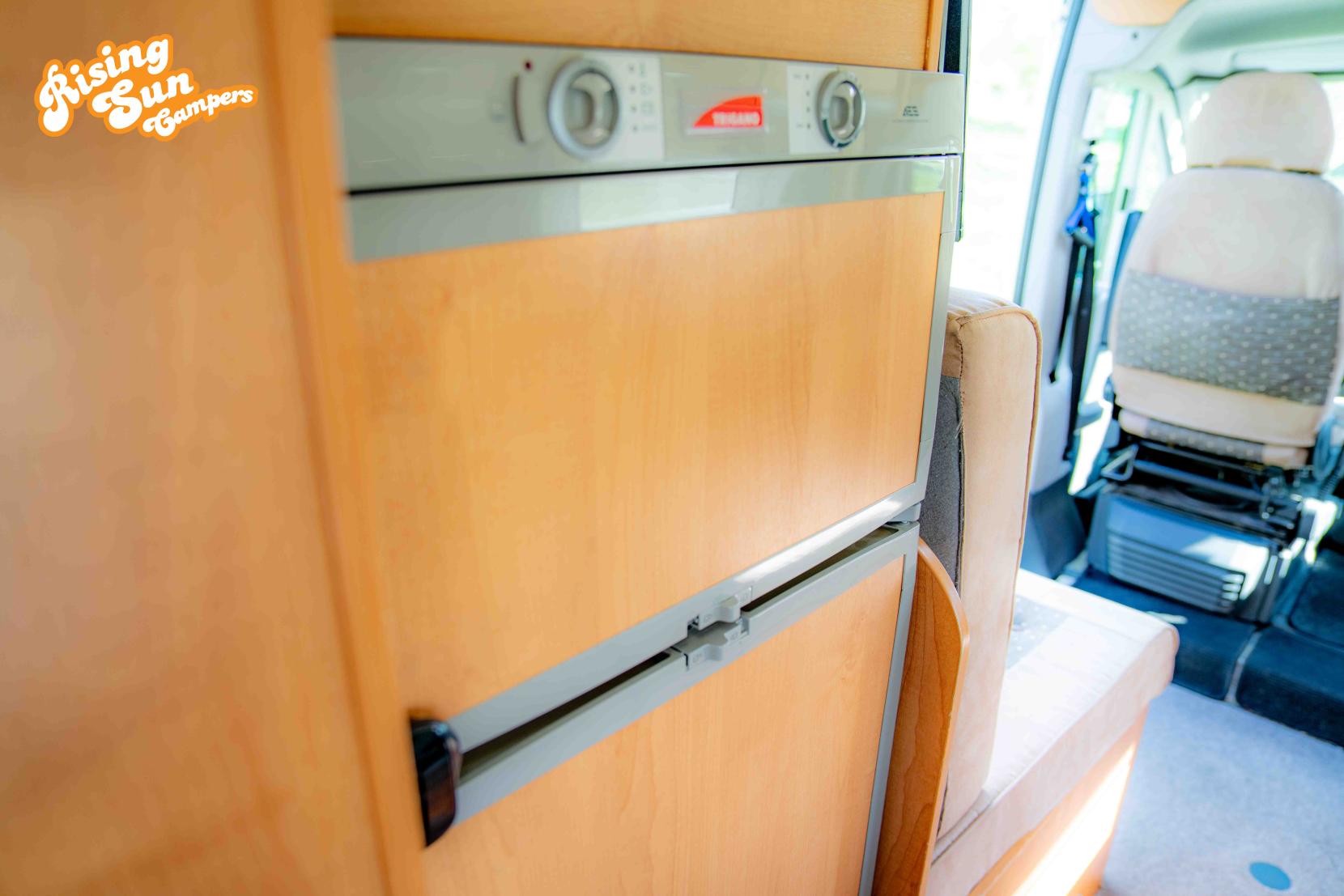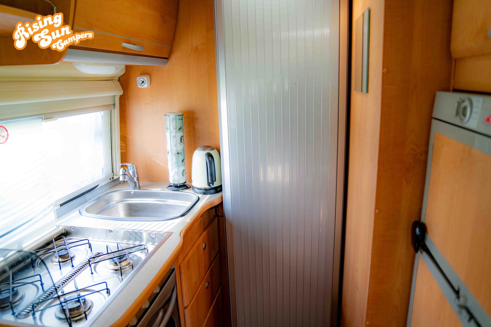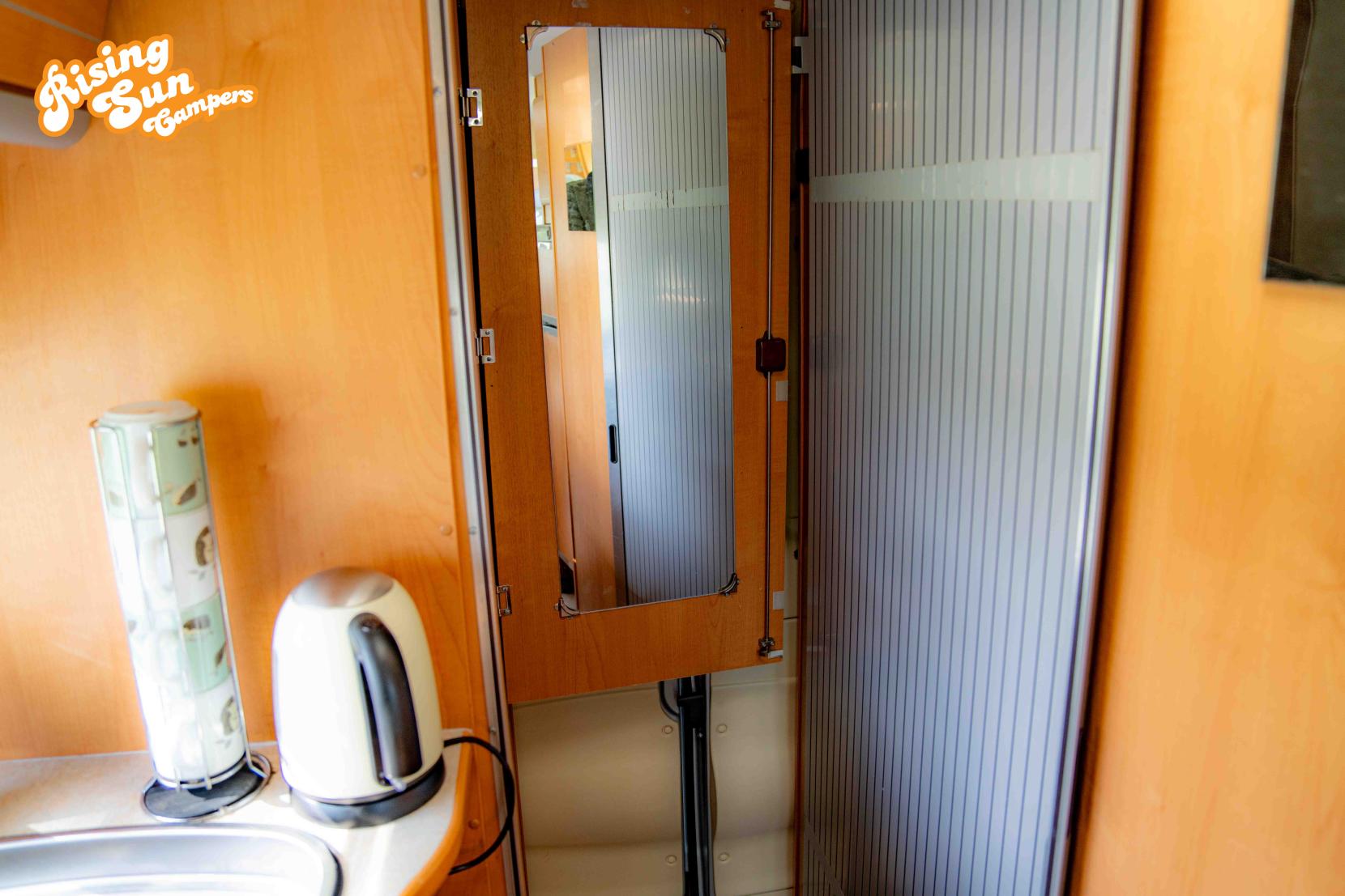 For a van conversion the central kitchen is amazingly well equipped consisting of a four burner hob, oven with grill, large capacity fridge with a separate freezer, sink and plenty of cupboard space. Beyond the kitchen and at the rear is a wardrobe, opposite the bathroom which includes a Thetford toilet, wash handbasin and a separate shower. The van has also been professionally modified at the rear with a tambour door to enlarge the shower/dressing area.