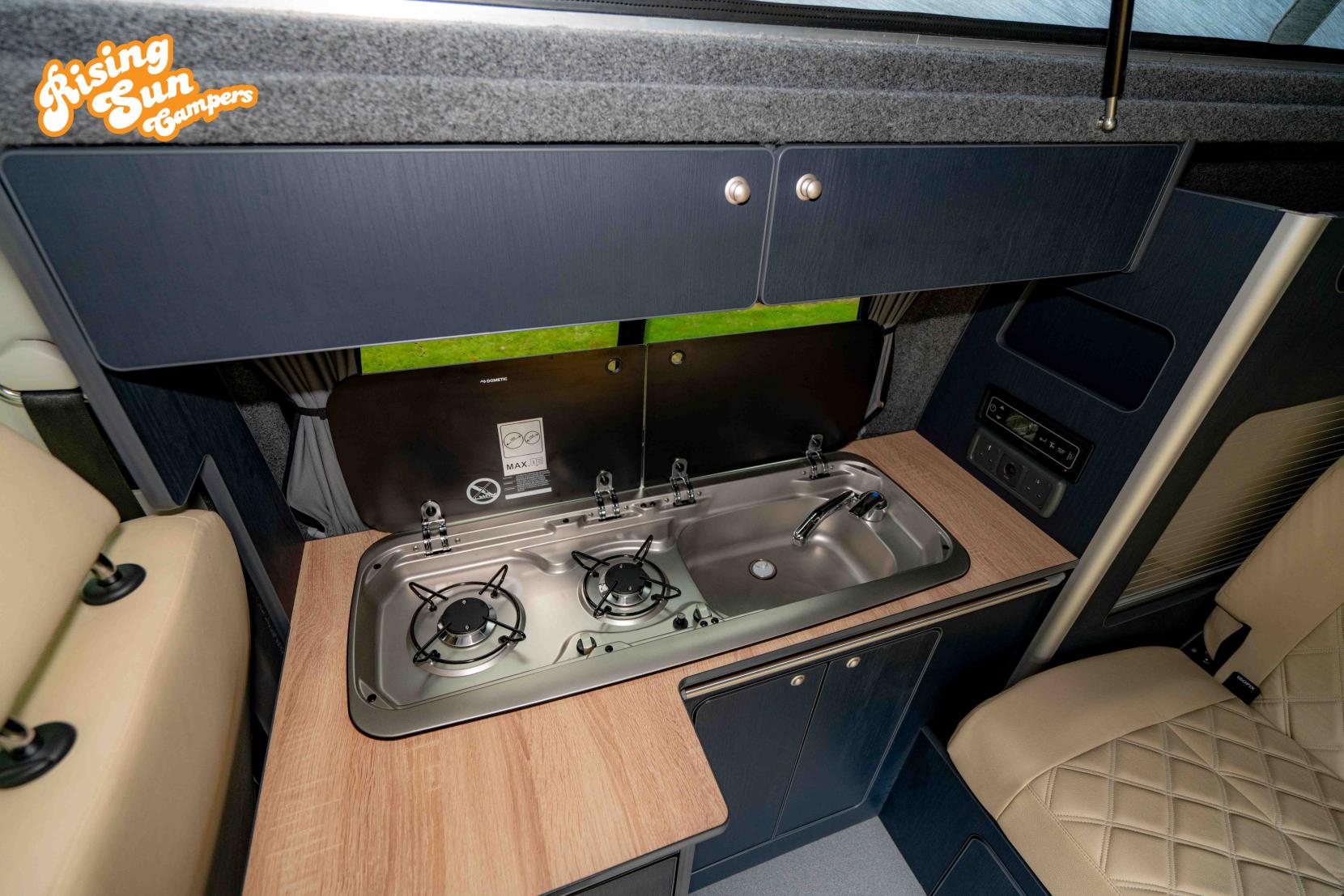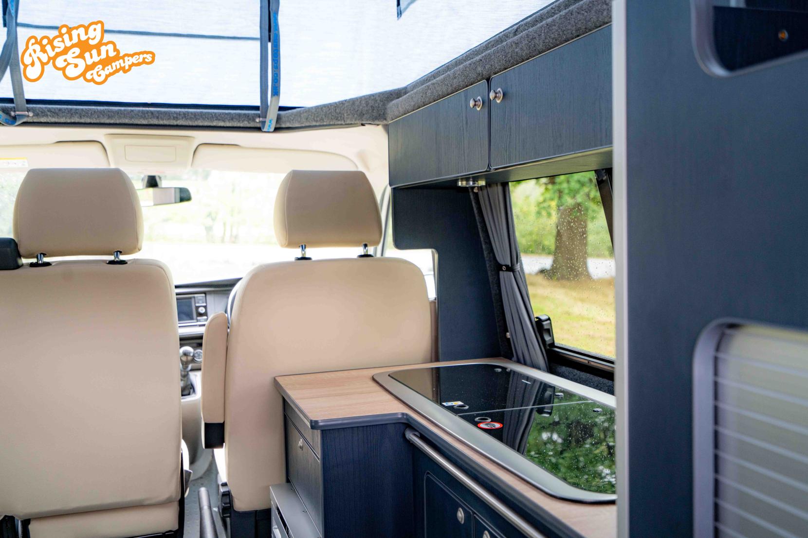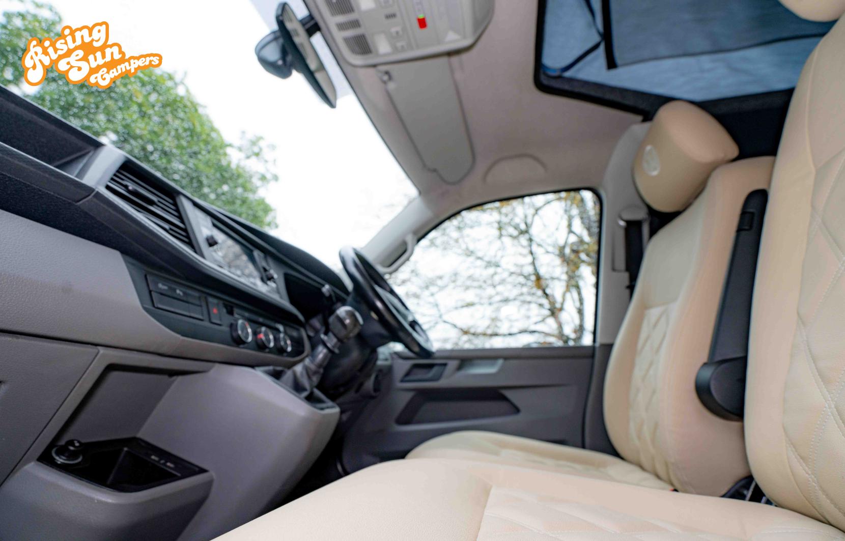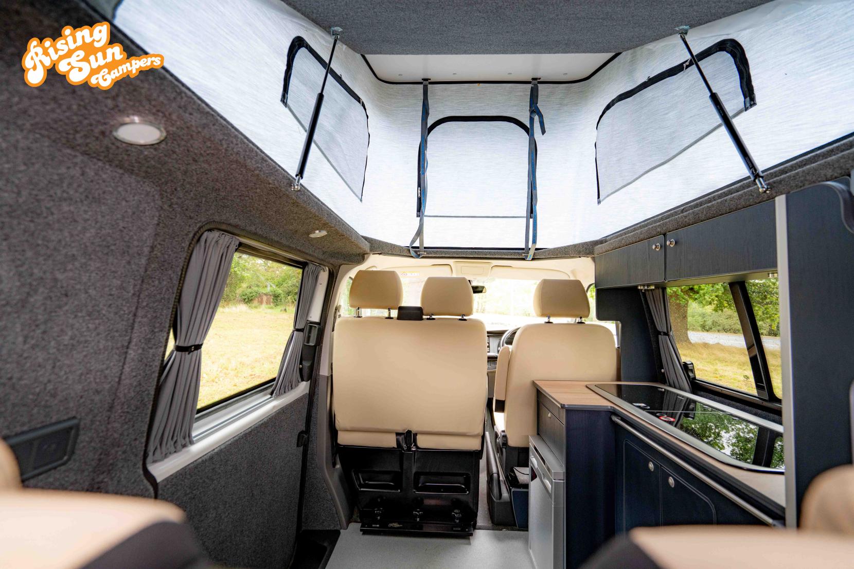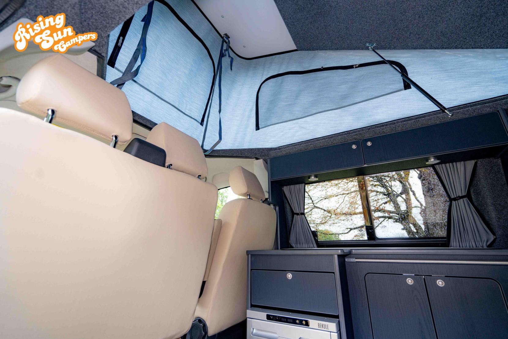 The signature conversion includes the following items:1 fixed window in privacy tint including curtain, 1 Sliding window in privacy tint including curtain, Complete van carpet lining, Plylining, Insulation, Victron B2B Charger, 110ah Leisure battery, Hardwearing Altro flooring in dolhpin, 4 LED spot lights, Power management system including integrated 240v battery charger and , External hookup housed neatly under the bonnet (No eyesores on the outside of your van), 1 x 12v Berker power outlet, 2 x Berker 240v socket, 1 x Berker USB socket, Touch screen power management interface, Signature furniture in lightweight plywood, Smev hob and sink combination unit inc tap, Sealed, steel gas locker & Regulator, Fresh water, waste pipes and submersible pump, Removable water tank (To allow easy filling at the campsite), 112cm RIB crash tested bed trimmed in toffee vinyl, 1 double Swivel base , Vinyl upholstery on front seats, 50 litre Fridge. Includes Austops elevating roof with roof bed. Seats and bed trim can be changed if not to your taste.
