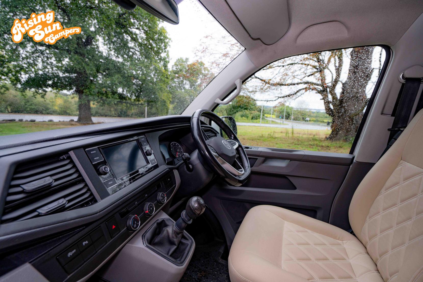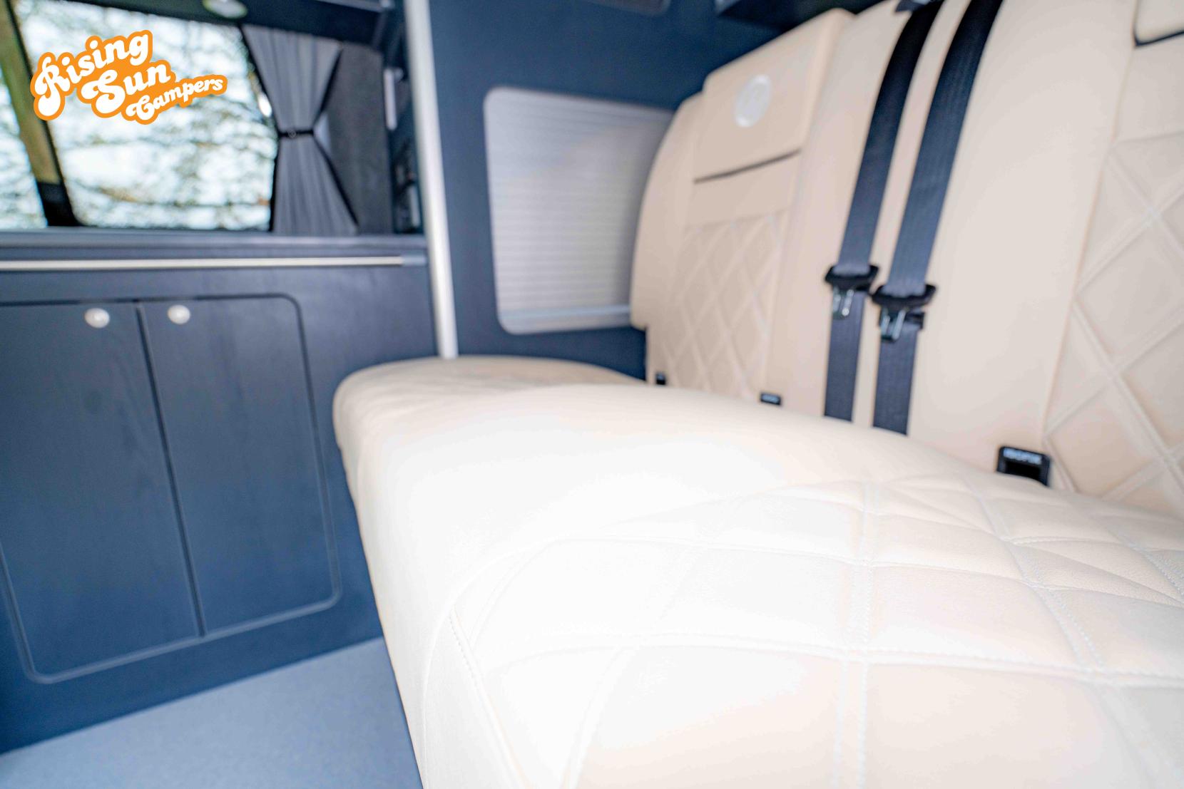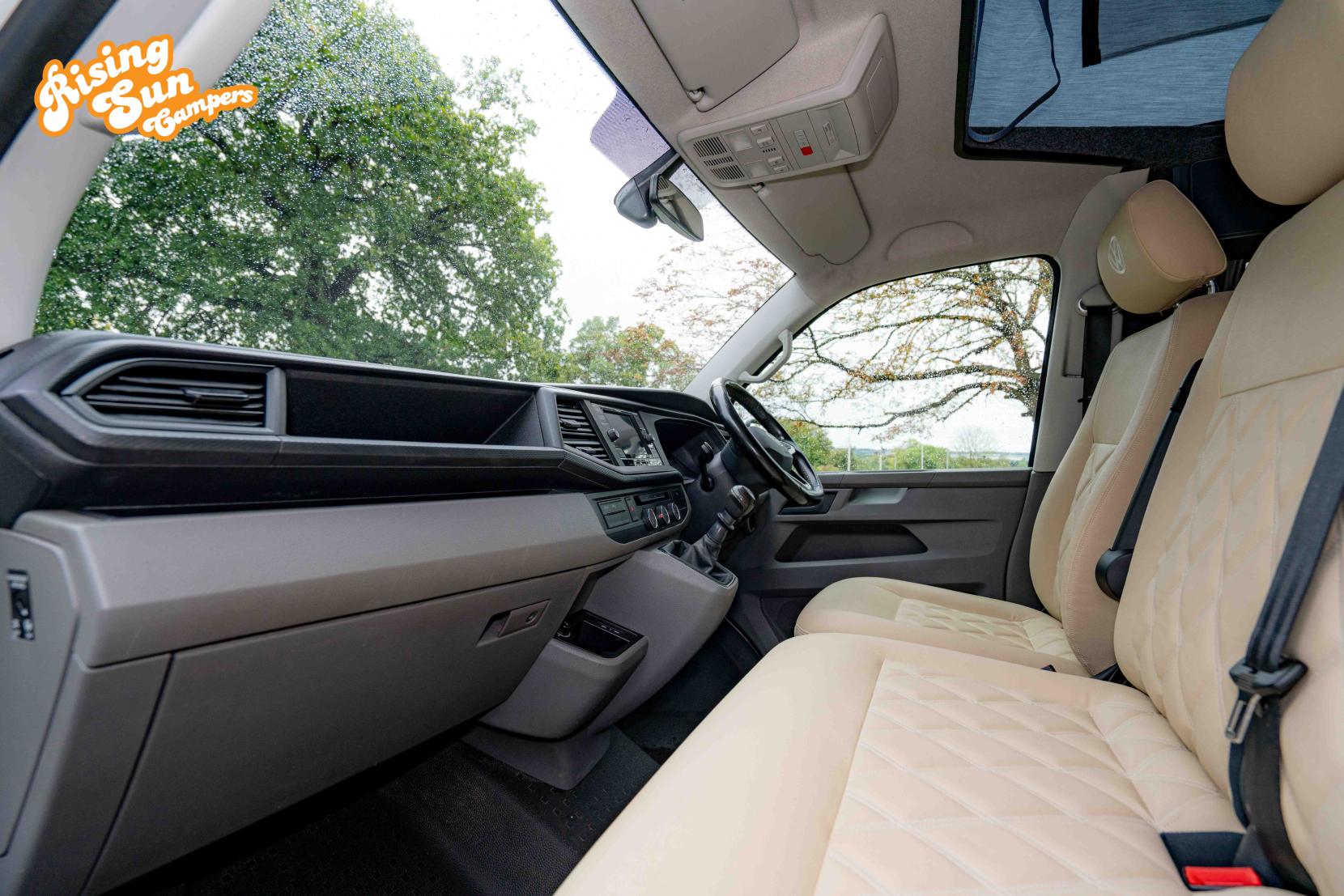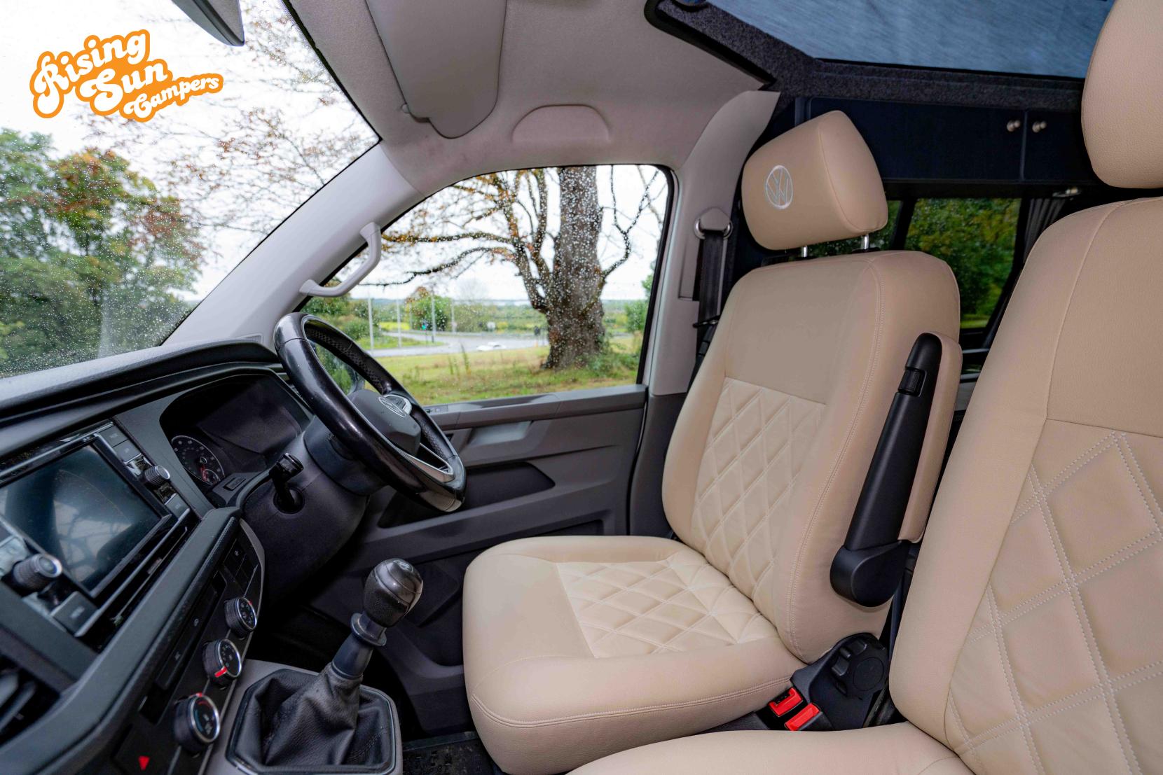 The signature conversion includes the following items:1 fixed window in privacy tint including curtain, 1 Sliding window in privacy tint including curtain, Complete van carpet lining, Plylining, Insulation, Victron B2B Charger, 110ah Leisure battery, Hardwearing Altro flooring in dolhpin, 4 LED spot lights, Power management system including integrated 240v battery charger and , External hookup housed neatly under the bonnet (No eyesores on the outside of your van), 1 x 12v Berker power outlet, 2 x Berker 240v socket, 1 x Berker USB socket, Touch screen power management interface, Signature furniture in lightweight plywood, Smev hob and sink combination unit inc tap, Sealed, steel gas locker & Regulator, Fresh water, waste pipes and submersible pump, Removable water tank (To allow easy filling at the campsite), 112cm RIB crash tested bed trimmed in toffee vinyl, 1 double Swivel base , Vinyl upholstery on front seats, 50 litre Fridge. Includes Austops elevating roof with roof bed. Seats and bed trim can be changed if not to your taste.