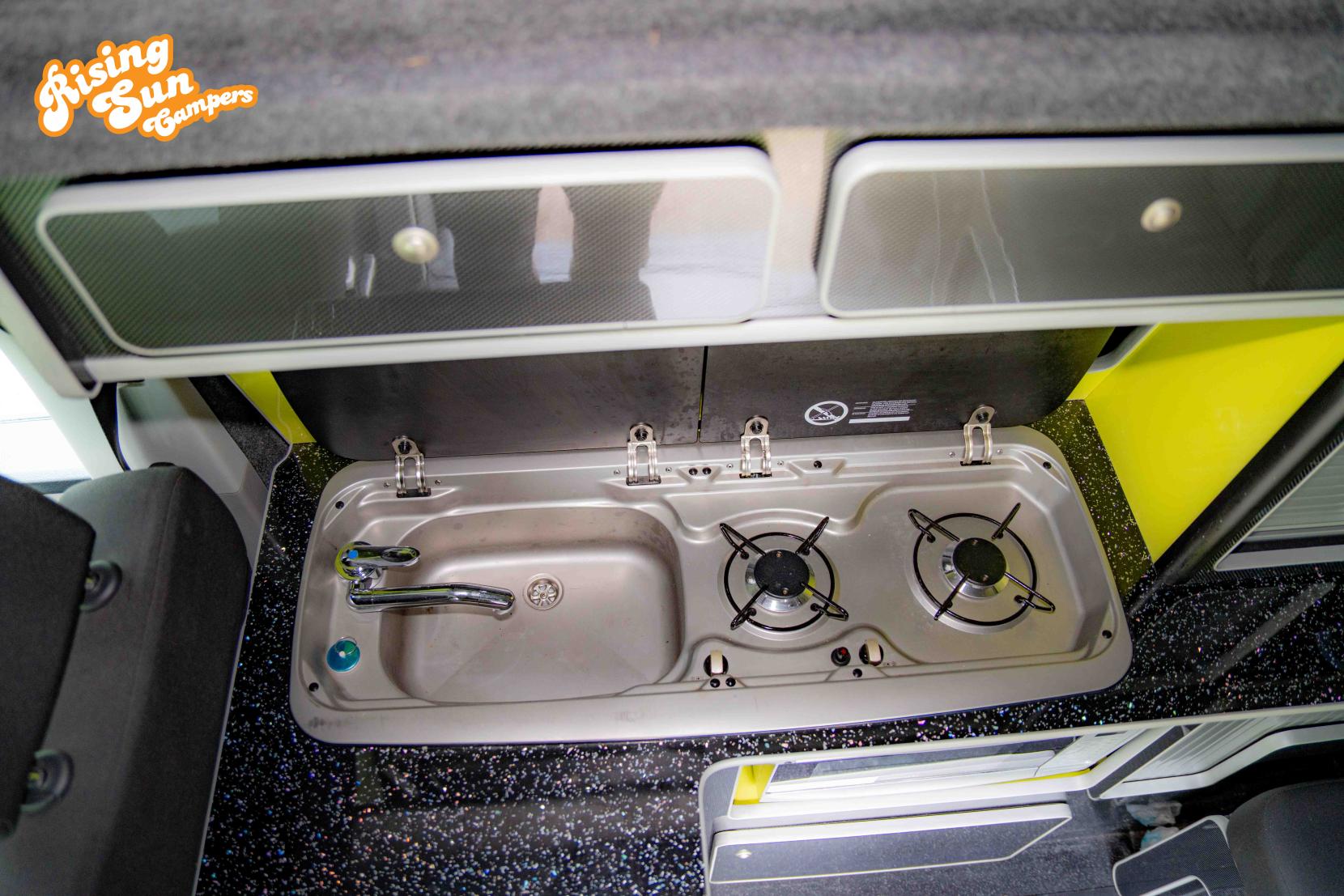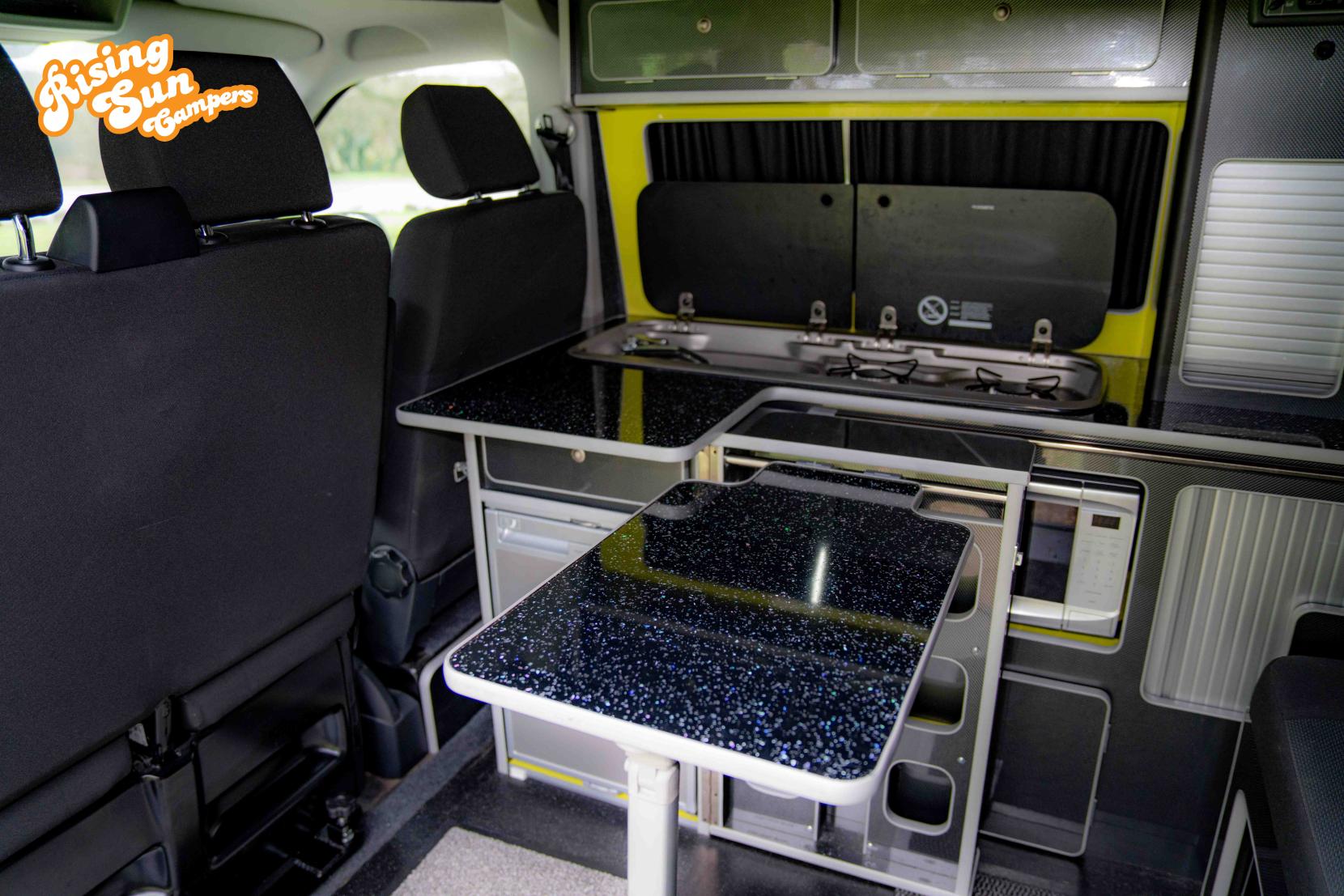 This van has been professionally converted to a high standard by Campaway. It features glass all round for great visibility, paired with curtains which are not only neat but thermal and blackout. The camper furniture is finished in grey with black sparkle worktop to compliment it. There is a 2 burner hob, sink , microwave and fridge for all those cooking needs. To keep you warm on the chilly nights there is a gas heater fitted