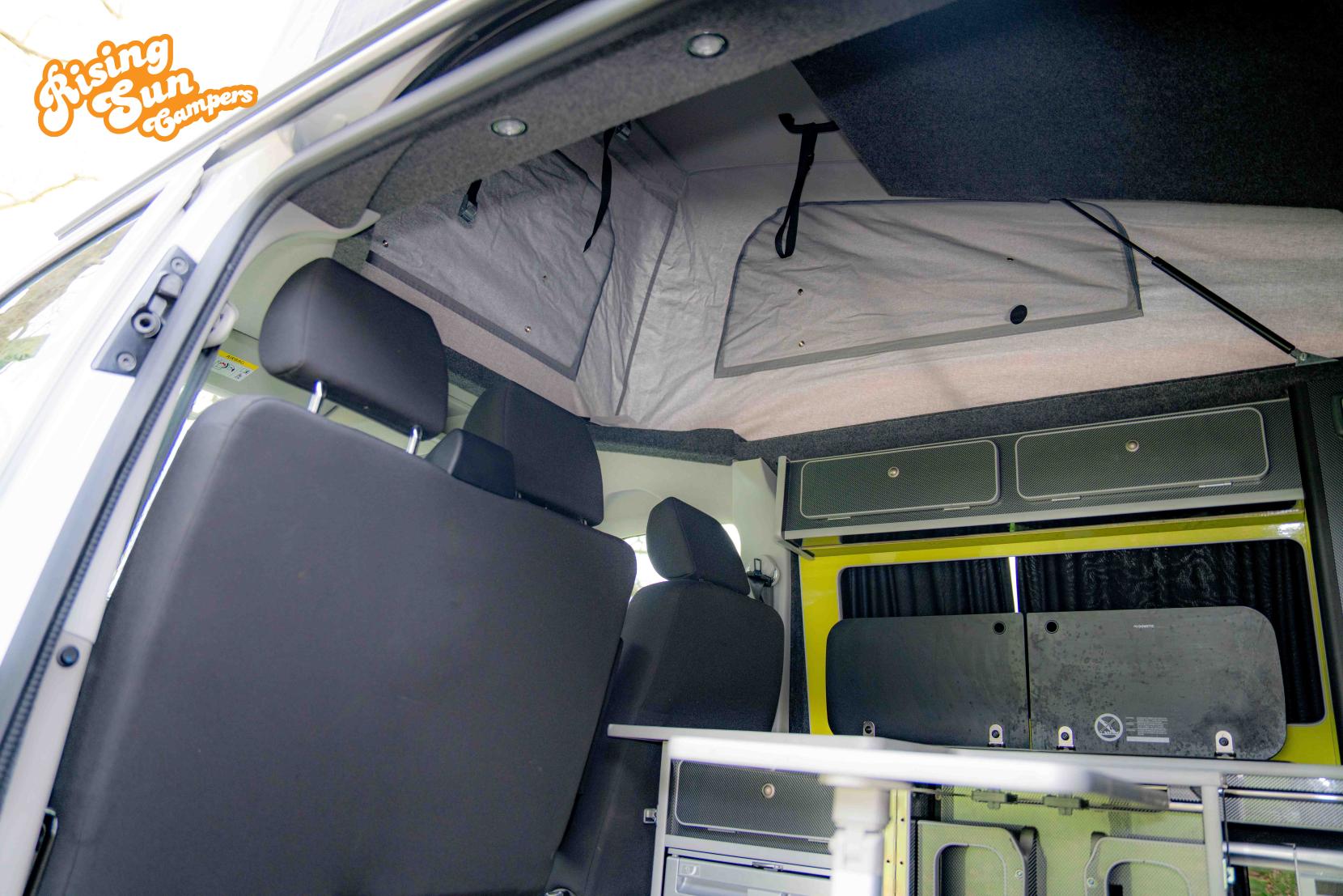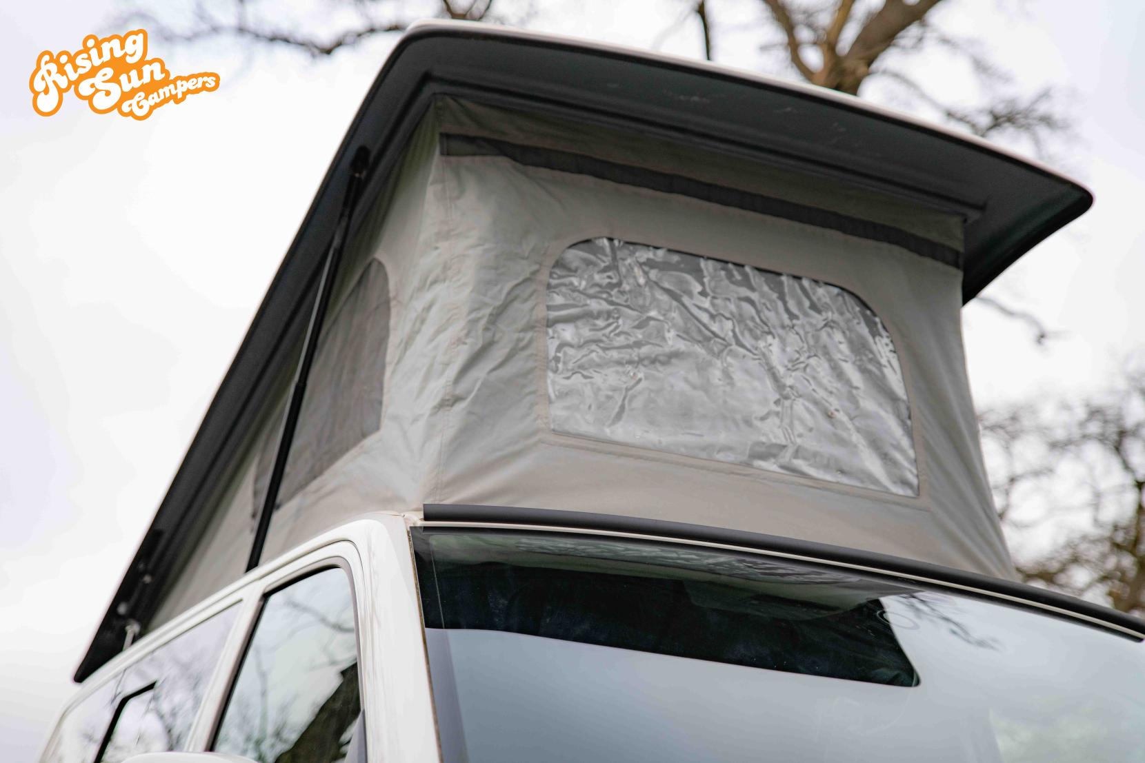 The camper features an elevating roof giving not only headroom to stand but also a further bed for 2 people.