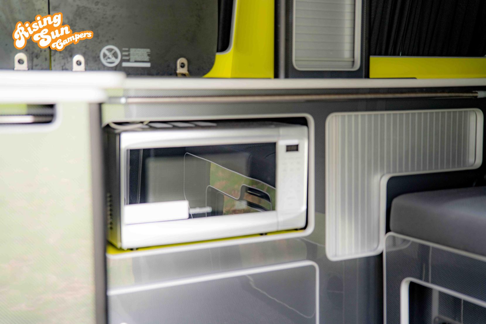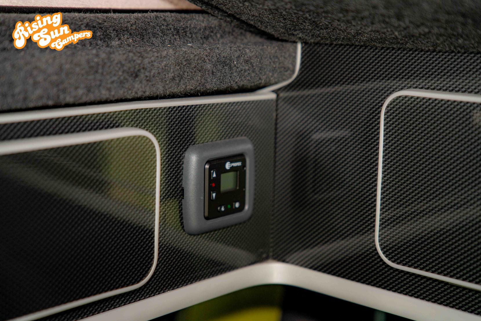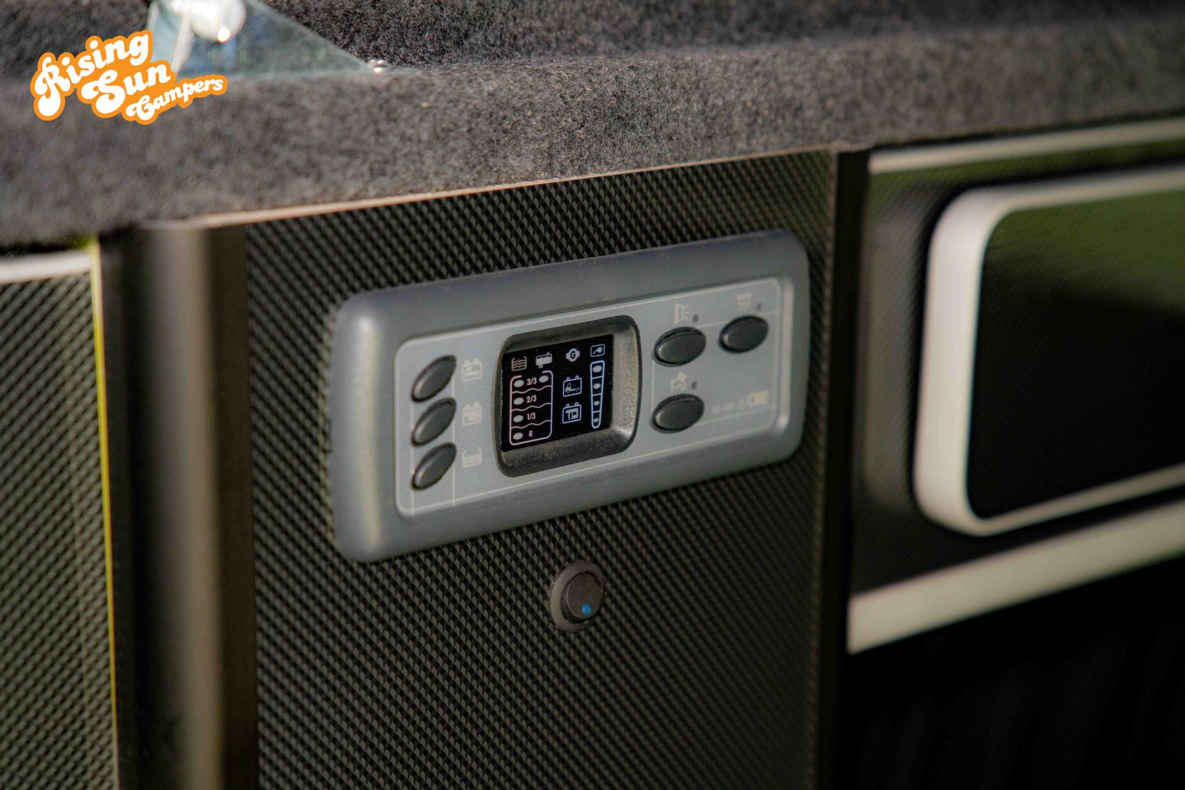The van is equipped with a 12v and 240v power system providing power when camping and also providing charging when driving and hooked up. There are a number of sockets around the van and also wireless charging for phones.