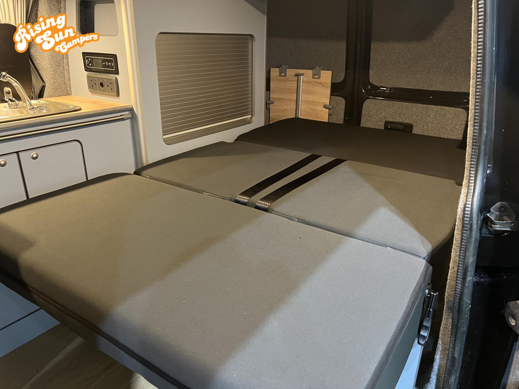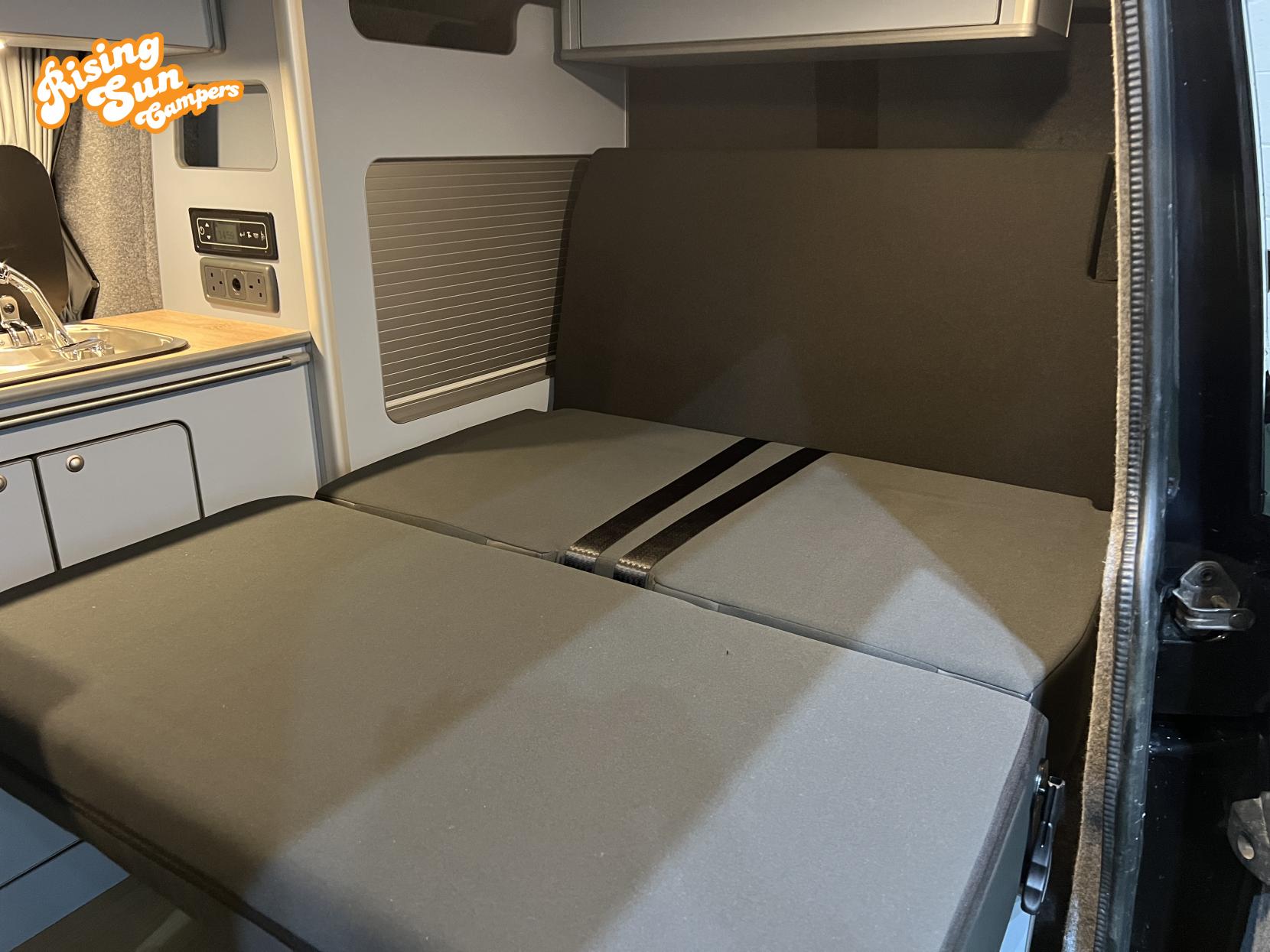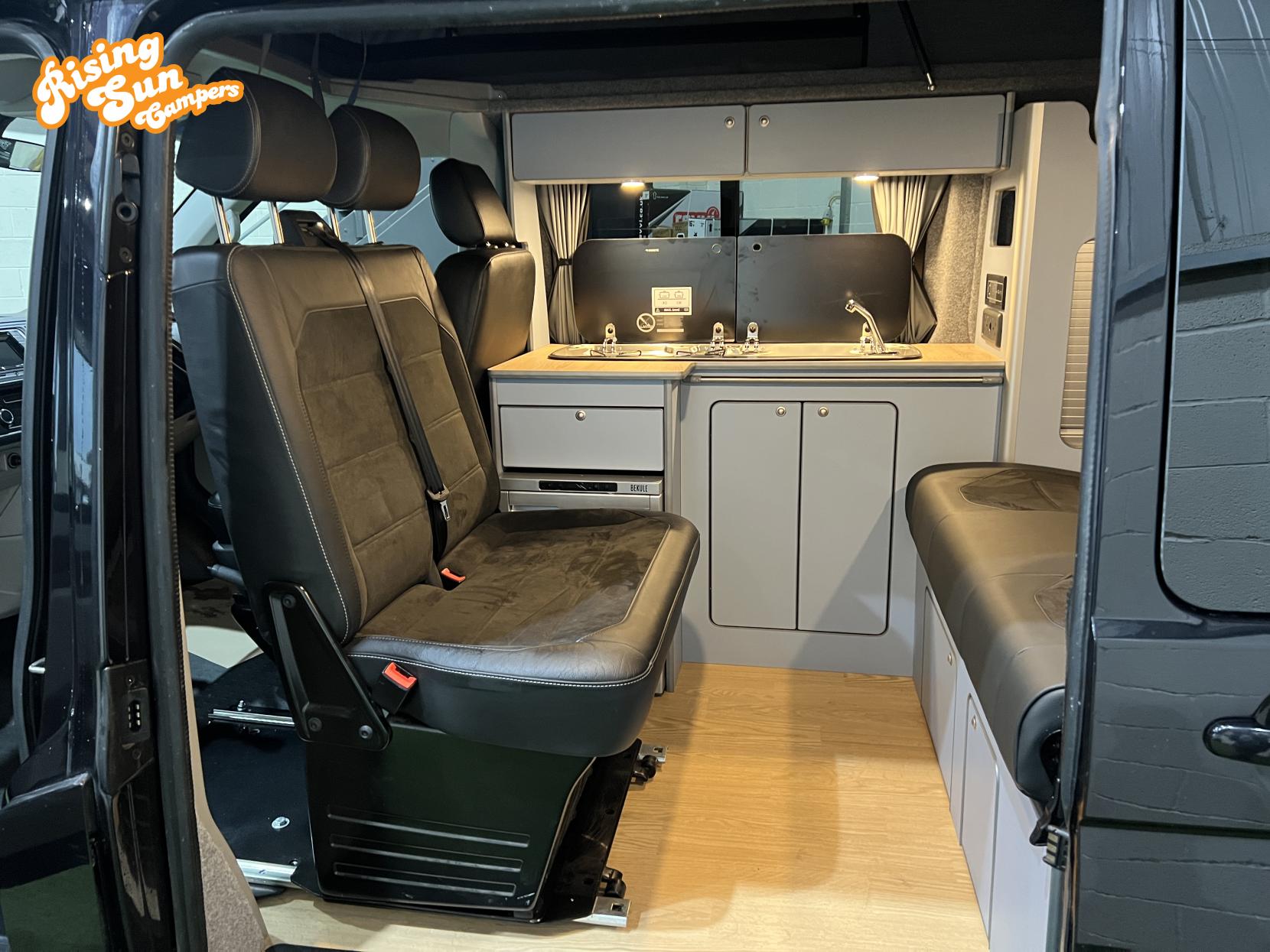 This conversion features our lightweight furniture system. The centrepiece is the 112cm RIB crash-tested bed, fully certificated in the correct installation position for the VW Transporter. Upholstery is in black vinyl with black suede centres.