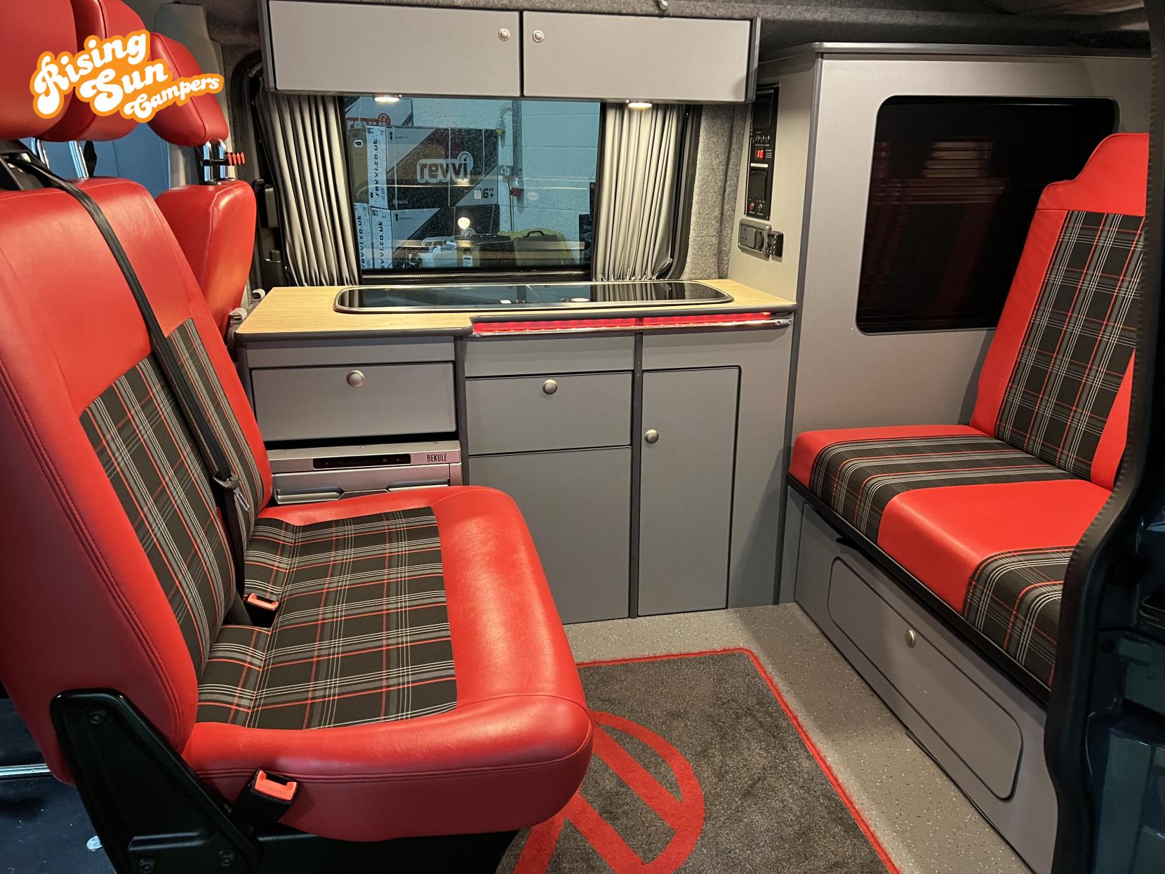 This Transporter conversion package has storage a plenty, and includes a Crash Tested rock and roll bed upholstered in your choice of cloth or vinyl.